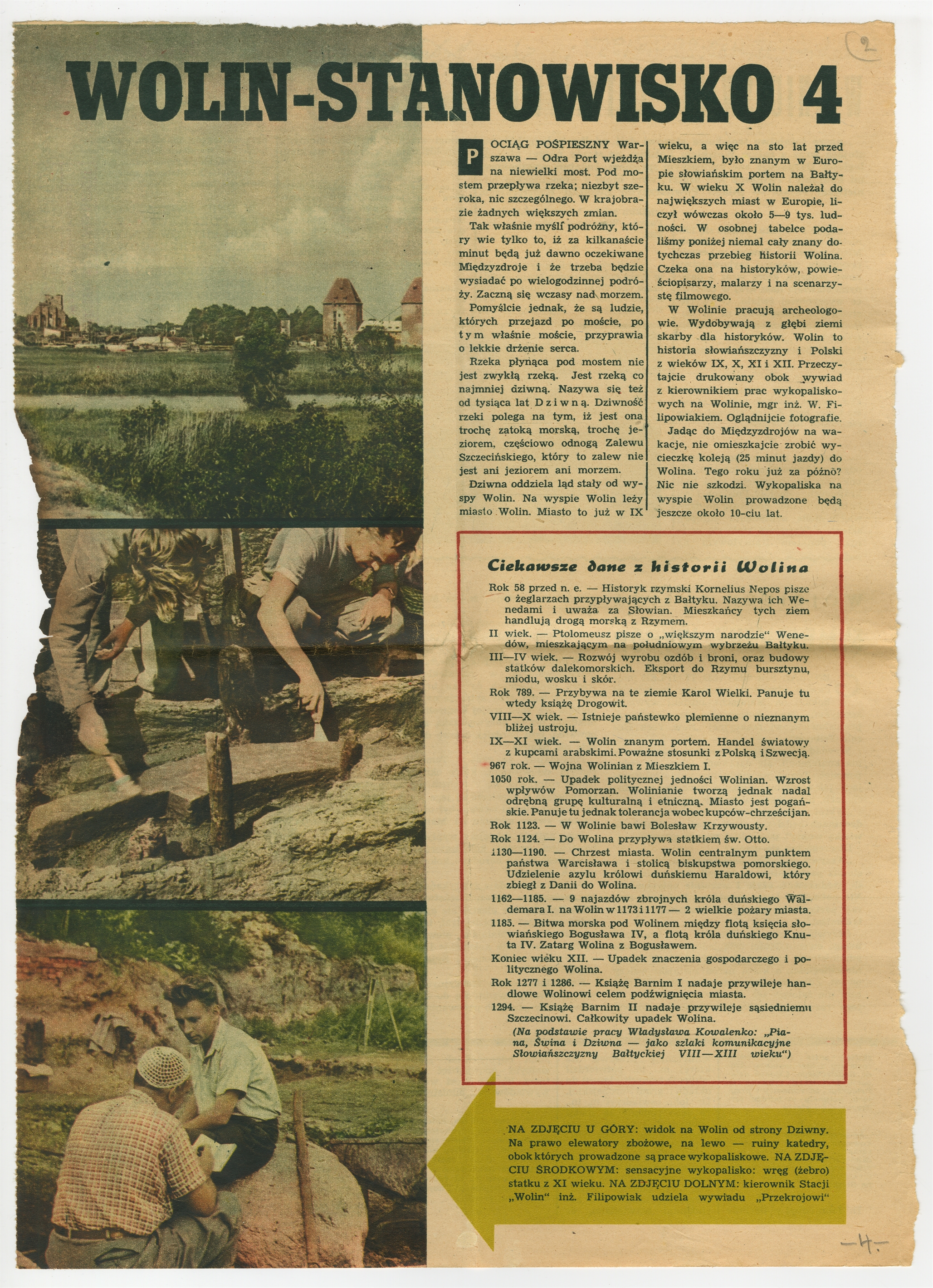 Wycinek prasowy pochodzący z "Przekroju" Nr 489 22 VIII 1954 ss. 4-6 zatytułowany "Wolin - stanowisko 4" - strona 1: "Pociąg pośpieszny" … "udziela wywiadu "Przekrojowi"" (strona 2)