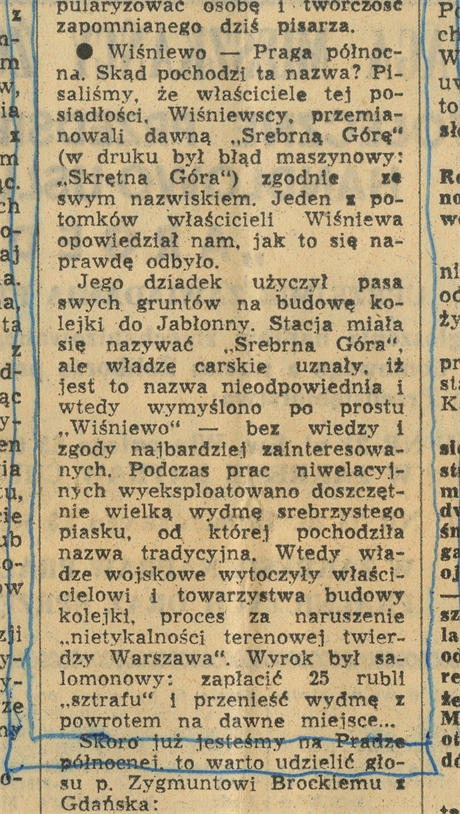 Wycinek prasowy pochodzący z "Życia Warszawy" Nr 251 20-21 X 1974 r. dotyczący historii posiadłości Srebrna Góra-Wiśniewo na terenie Pragi Północ w Warszawie - strona 1: "Wiśniewo - Praga północna" … "na dawne miejsce" (strona 9)