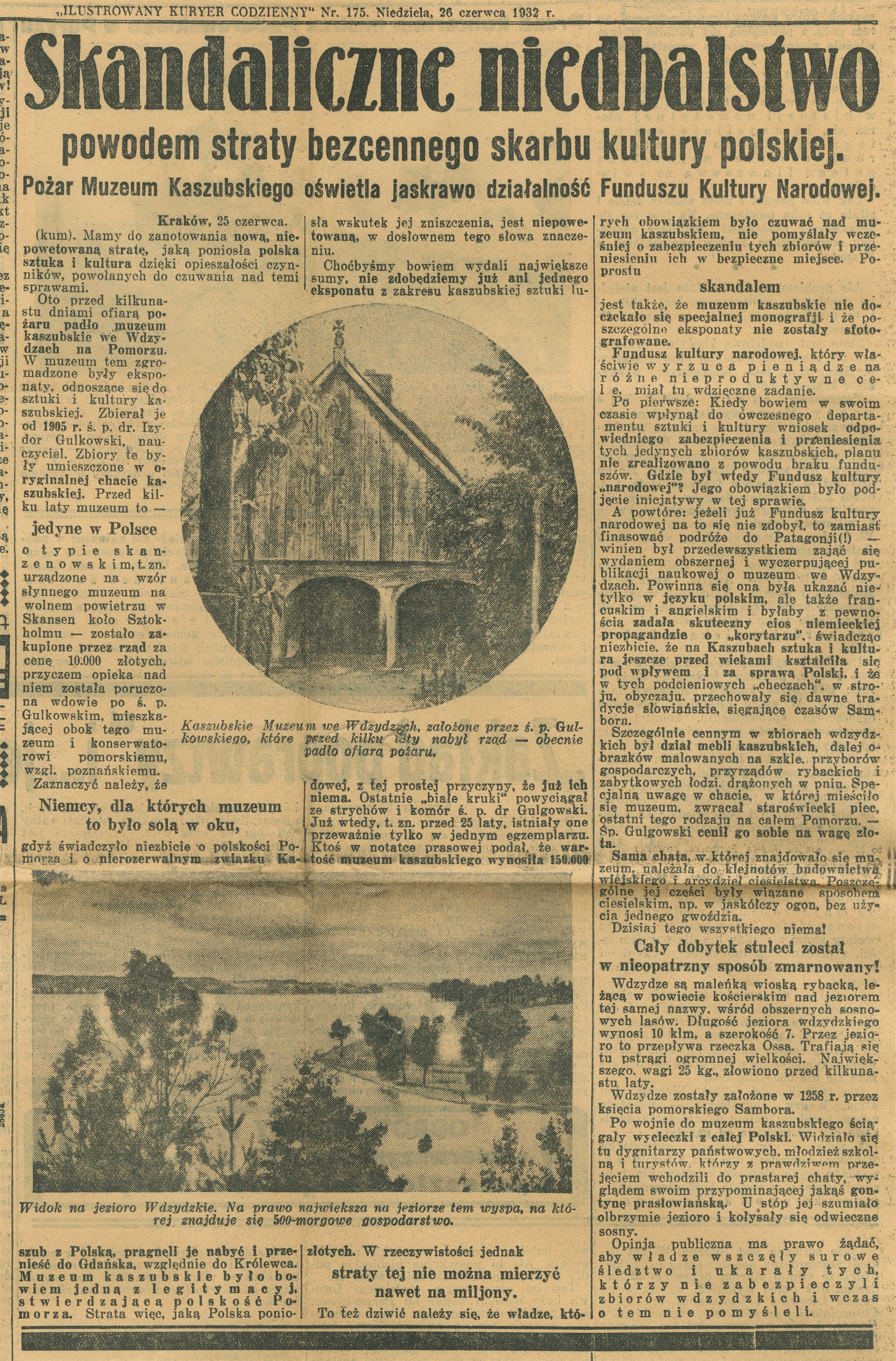 Wycinek prasowy: Skandaliczne niedbalstwo powodem straty bezcennego skarbu kultury polskeij. Pożar Muzeum Kaszubskiego oświetla jaskrawo dziełalność Funduszu Kultury Narodowej "Ilustrowany Kuryer Codzienny" nr 175 niedziela 36 czerwca 1932 r. s. 4