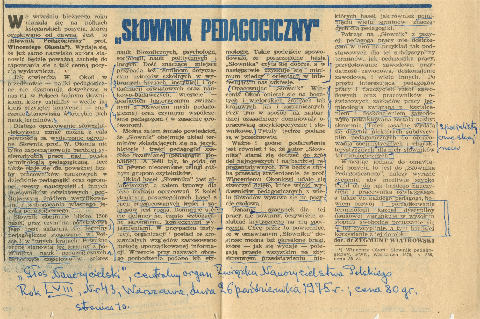 Wycinek prasowy: Słownik pedagogiczny "Głos nauczycielski" Rok LVIII nr 43 (462) 26 października 1975 r. s. 10 - strona 1: "We wrześniu bieżącego roku ukazała się (…)"