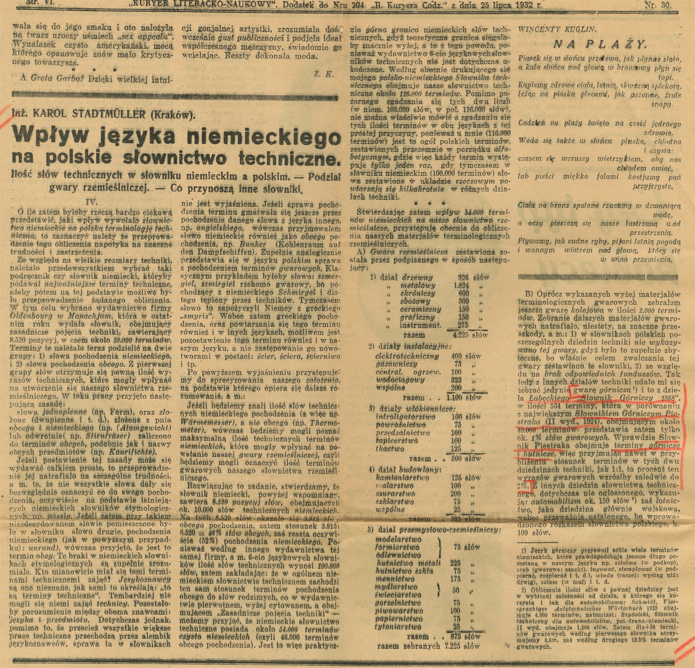 Wycinek prasowy: Wpływ języka niemieckiego na polskie słownictwo techniczne "Kuryer literacko-naukowy" nr 30 s. VI Dodatek do Nru 204 "Ilustrowanego Kuryera Codziennego" 25 lipca 1932 r. - strona 1: "O ile zatem byłoby rzeczą bardzo ciekawą przedstawić jaki wpływ (...)"