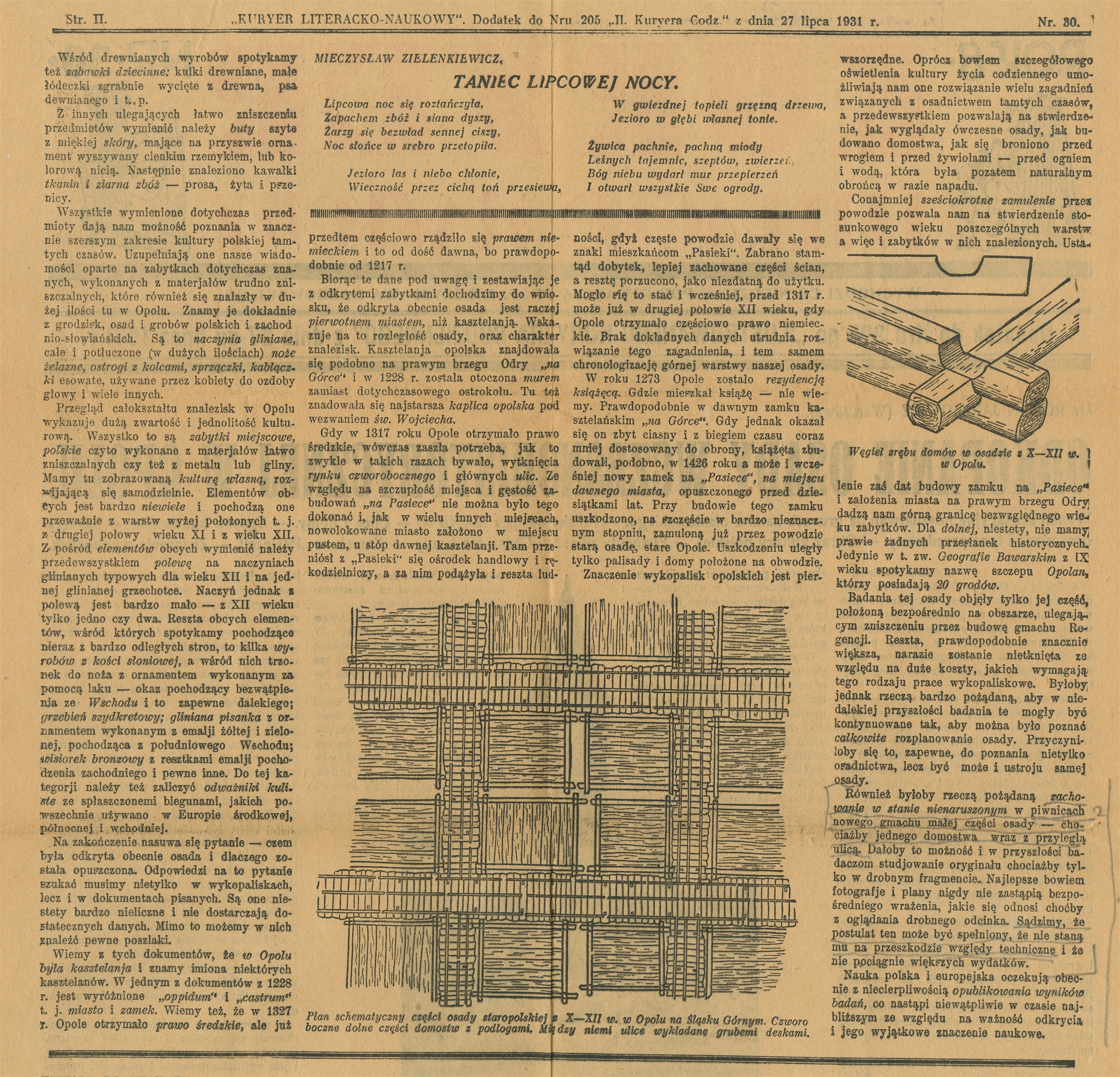 Wycinek prasowy z czasopisma "Kuryer Literacko-Naukowy" - nr 30 (dodatek do nr 205 "Il. Kuryera Codz. z dnia 27 lipca 1931 roku) z artykułem Romana Jakimowicza pt.:"Odkopanie osady wczesnohistorycznej w Opolu" (cd)