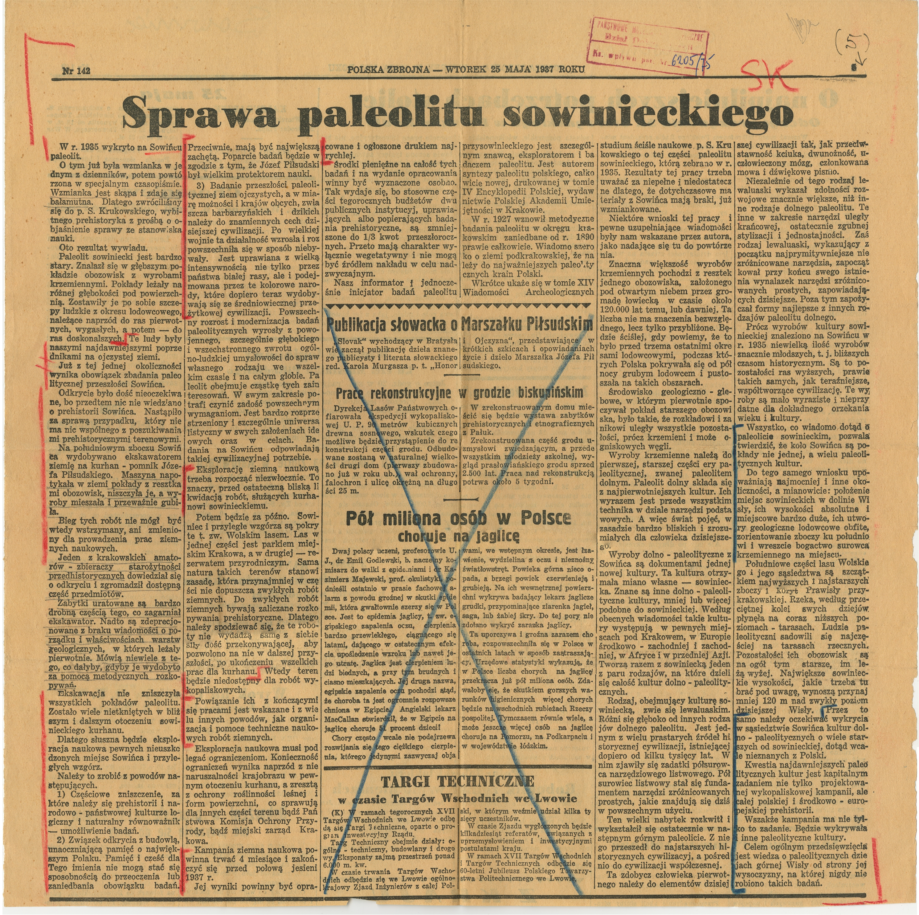 Wycinek prasowy z czasopisma "Polska Zbrojna" nr 142 s.5. z dnia 25 maja 1937 roku z artykułem pt.:"Sprawa paleolitu sowinieckiego"