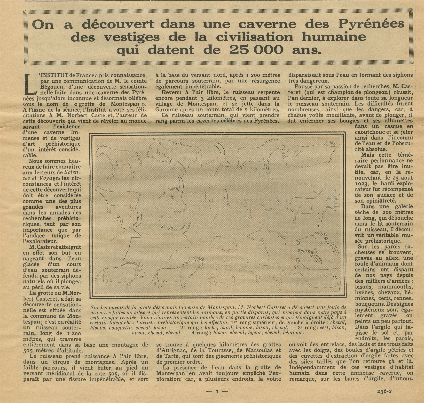 Wycinek prasowy z czasopisma "Sciences et Voyages" Nr 236 str 1 zatytułowany "On ? découvert dans une caverne des Pyrénées des vestiges de la civilisation humaine qui datent de 25 000 ans" 6 marca 1924r.