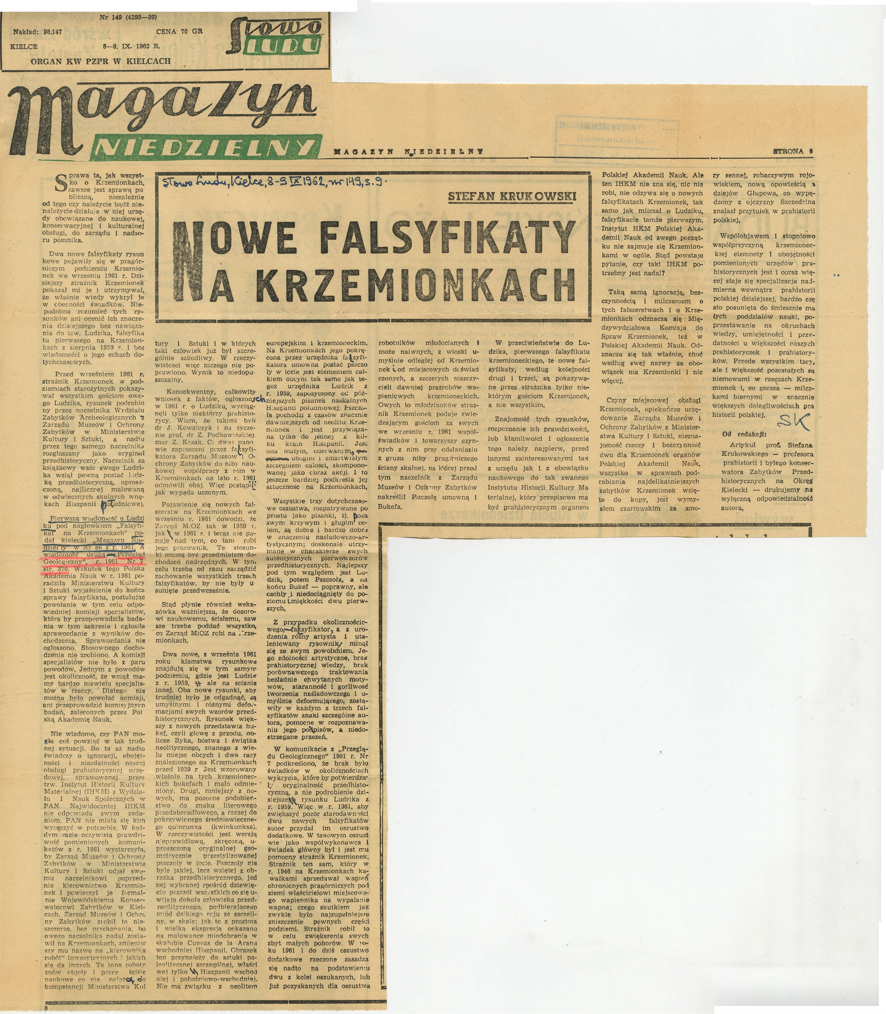 Wycinek prasowy z czasopisma "Słowo Ludu" - "Magazyn Niedzielny" nr 149 z dnia 8-9 września 1962 roku z artykułem Stefana Krukowskiego pt.:"Nowe falsyfikaty na Krzemionkach"