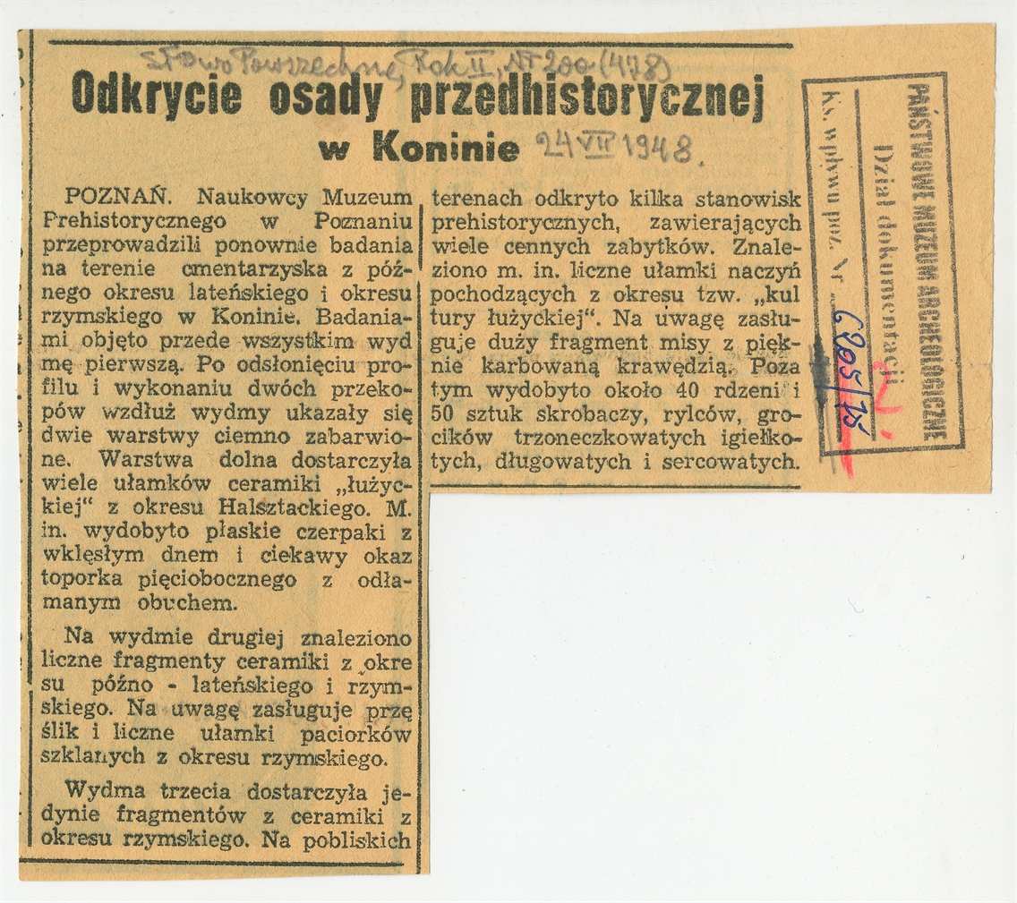 Wycinek prasowy z czasopisma "Słowo Powszechne" nr 200 (478) z dnia 24 VII 1948 z notatką prasową pt.:"Odkrycie osady przedhistorycznej w Koninie"