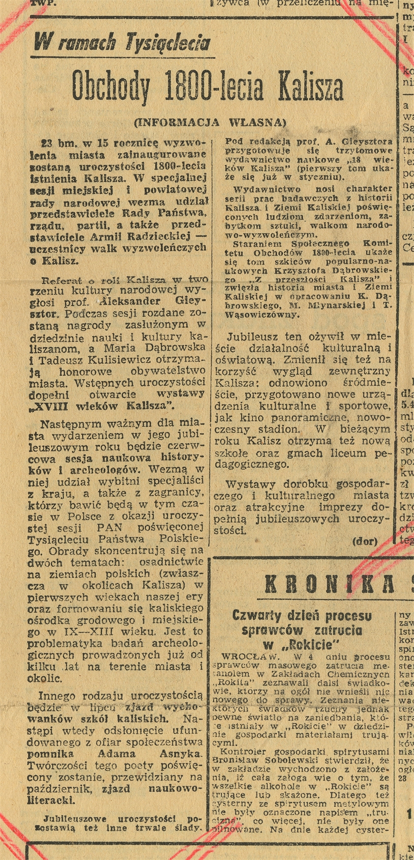 Wycinek prasowy z czasopisma "Trybuna Ludu" nr 12 s.5. z dnia 12 I 1960 roku z notatką prasową pt.:"Obchody 1800-lecia Kalisza"