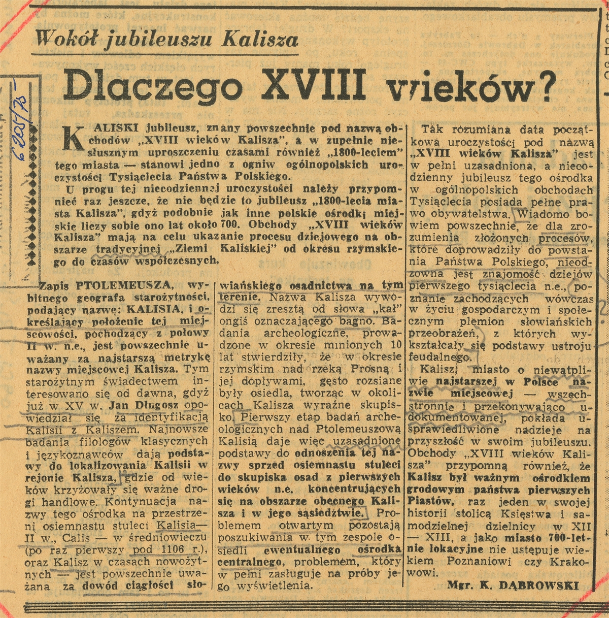 Wycinek prasowy z czasopisma "Trybuna Ludu" nr 17 s.4. z dnia 18 I 1960 roku z notatką prasową pt.:"Dlaczego XVIII wieków? Wokół jubileuszu Kalisza"