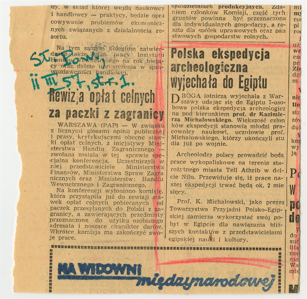 Wycinek prasowy z dziennika 'Słowo Powszechne" z dnia 11 III [19]57 roku z informacją wyjeździe polskiej ekspedycji archeologicznej do Egiptu