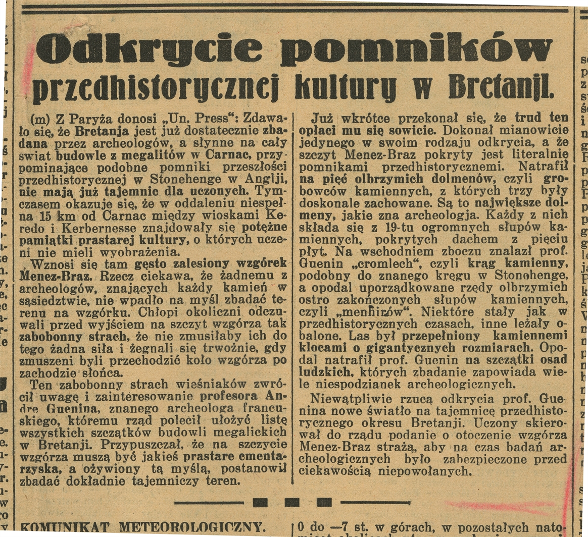 Wycinek prasowy z gazety "Ilustrowany Kuryer Codzienny" Nr 29 z 29 stycznia 1935 r. str 5 zatytułowany "Odkrycie pomników przedhistorycznej kultury w Bretanji"