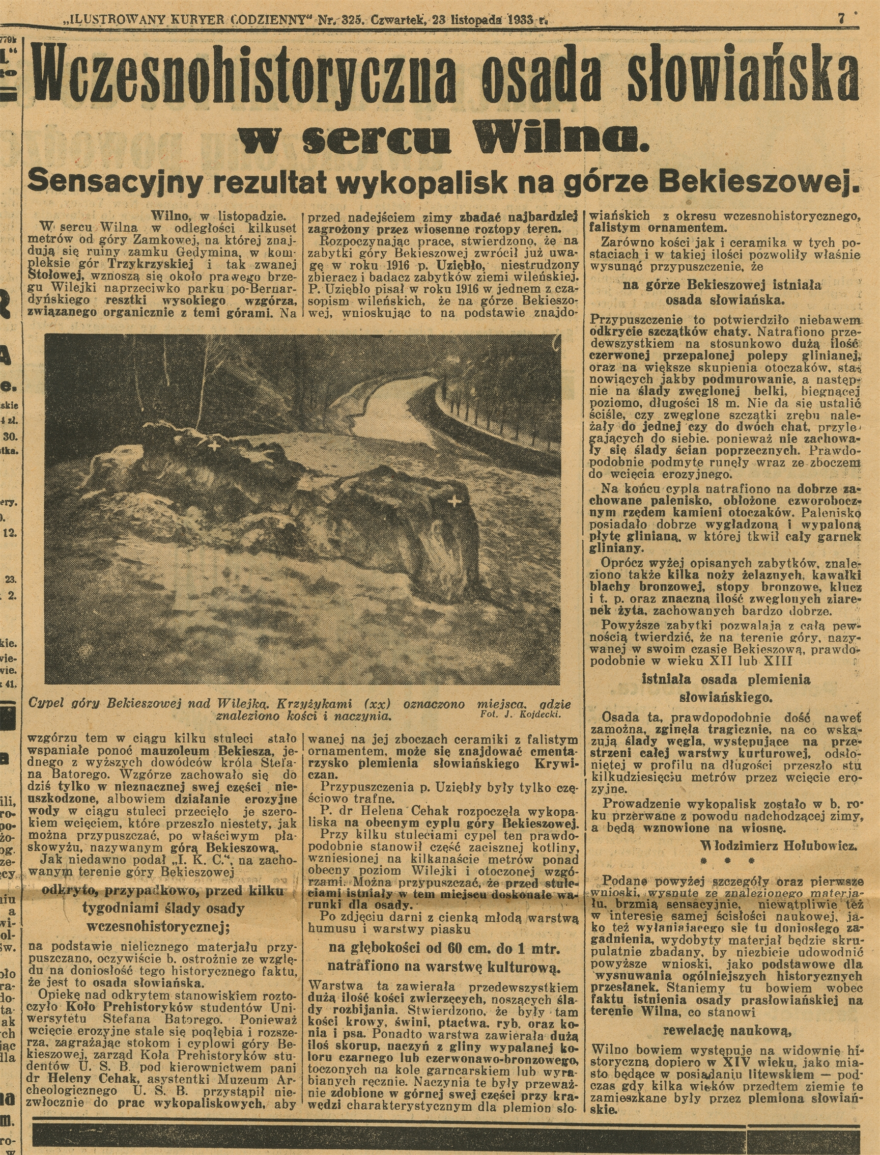 Wycinek prasowy z gazety "Ilustrowany Kuryer Codzienny" Nr 325 z 23 listopada 1933 r. zatytułowany "Wczesnohistoryczna osada słowiańska w sercu Wilna. Sensacyjny rezultat wykopalisk na górze Bekiszowej."