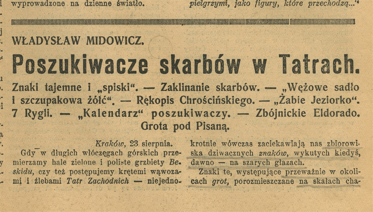 Wycinek prasowy z gazety "Kuryer Literacko Naukowy" Nr 34 z dnia 24 sierpnia 1931r. str. VIII zatytułowany "Poszukiwacze skarbów w Tatrach"