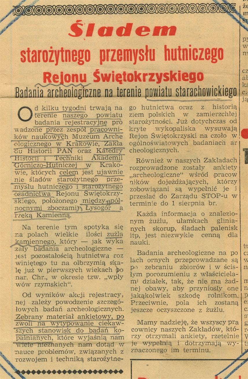 Wycinek prasowy z gazety "Nasze Słowo" Nr 29/30 z 30 VII 1958 r. zatytułowany "Śladem starożytnego przemysłu hutniczego Rejonu Świętokrzyskiego"
