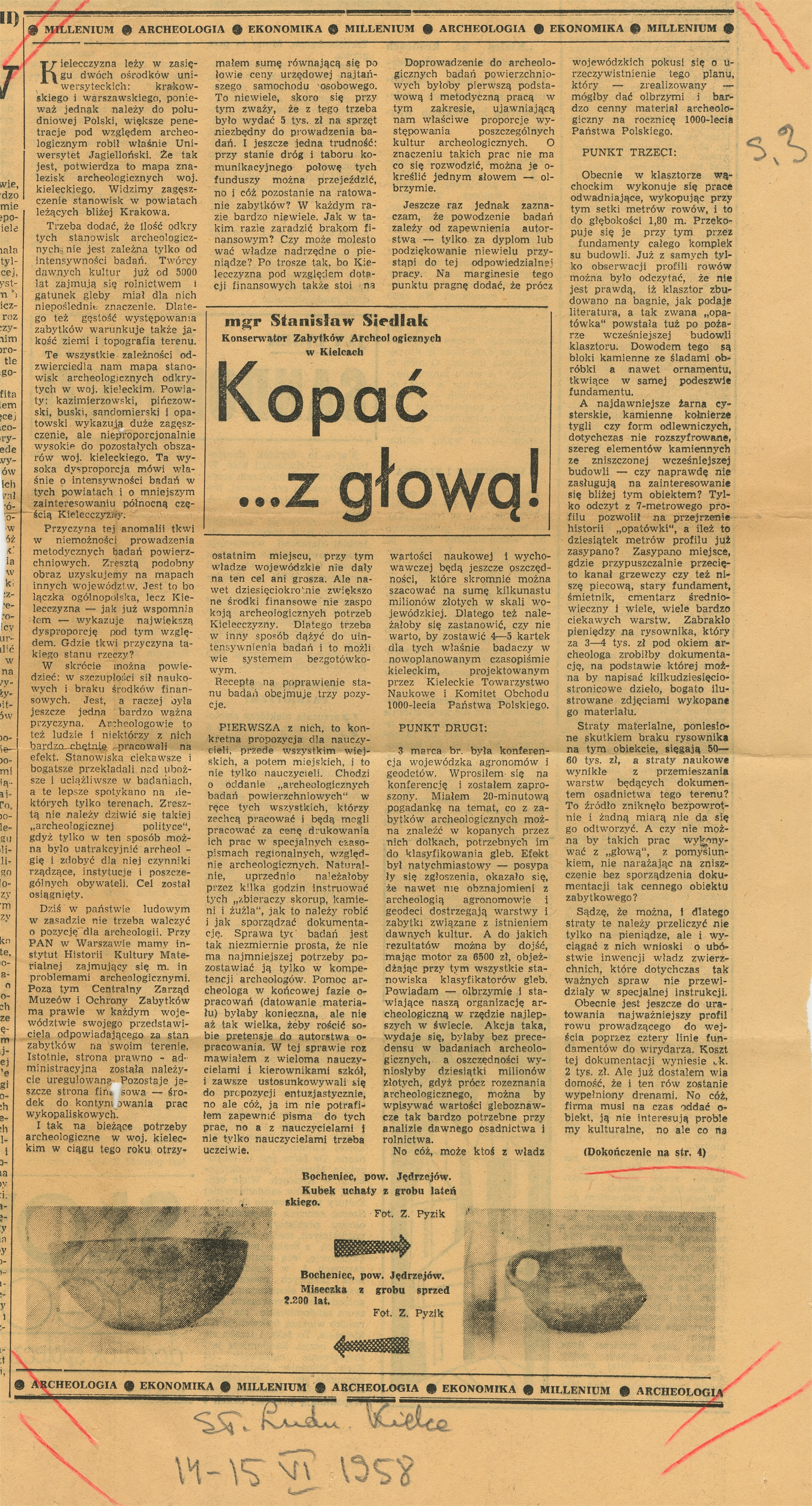 Wycinek prasowy z gazety "Słowo Ludu" Nr 140 z 14-15 czerwca 1958 r. zatytułowany "Kopać … z głową" - strona 3