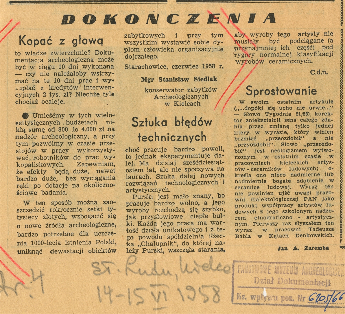 Wycinek prasowy z gazety "Słowo Ludu" Nr 140 z 14-15 czerwca 1958 r. zatytułowany "Kopać … z głową" - strona 4
