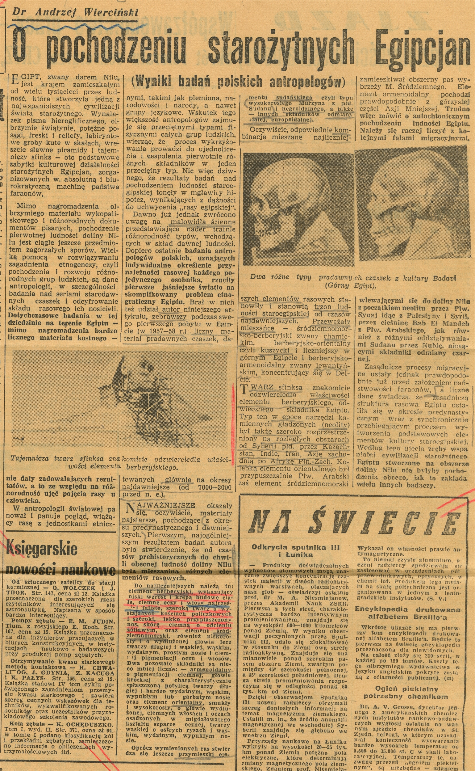 Wycinek prasowy z gazety "Życie Warszawy" z 26-27 IV 1959 r. str. 5 zatytułowany "O pochodzeniu starożytnych Egipcjan"