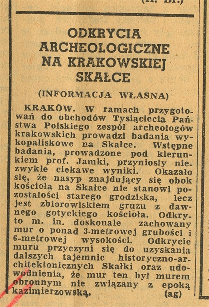 Wycinek prasowy z "Trybuny Ludu" Nr 19 wyd. B str 3 zatytułowany "Odkrycia Archeologiczne na Krakowskiej Skałce"; 20 stycznia 1958