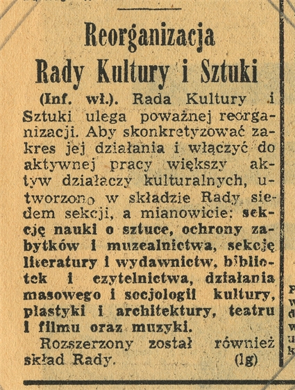 Wycinek prasowy z "Trybuny Ludu" Nr 24 wyd. A str 3 zatytułowany "Reorganizacja Rady Kultury i Sztuki"; 24 I 1959