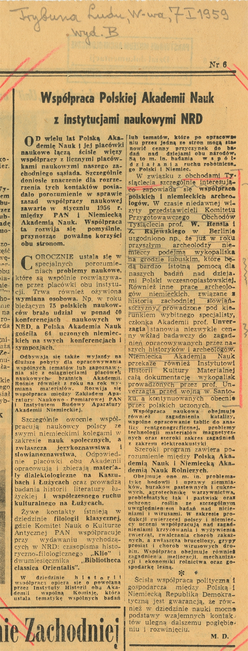 Wycinek prasowy z "Trybuny Ludu" Nr 6 wyd. B zatytułowany "Współpraca Polskiej Akademii Nauk z instytucjami naukowymi NRD"; 7 I 1959