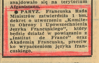 Wycinek prasowy: Ze świata. Paryż "Życie Warszawy" 5-6 grudnia 1965 r. s. nieokreślona - strona 1: "Francuska Rada Ministrów zatwierdziła (…)"