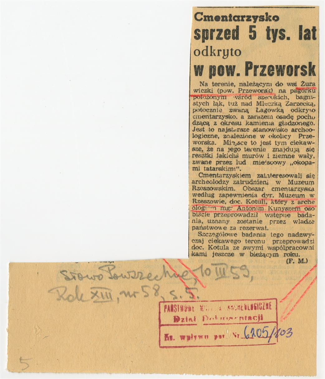 Wycinek z gazety „Słowo Powszechne” Rok XIII nr 58 s. 5 10 marca 1955 r. Artykuł: „Cmentarzysko sprzed 5 tys. lat odkryto w pow. Przeworsk” str. 1: „ Na terenie należącym do wsi Żurawiczki(...)”