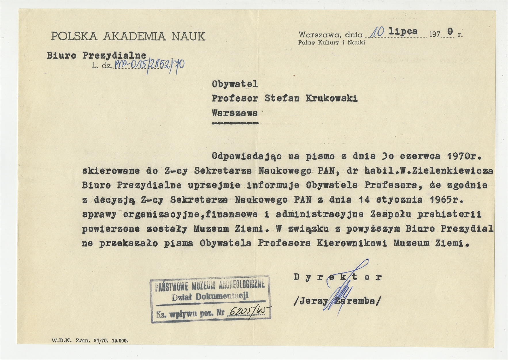 Wypełniony maszynopisem druk pisma Biura Prezydialnego Polskiej Akademii Nauk do Profesora Stefana Krukowskiego w sprawie powierzenia Muzeum Ziemi spraw organizacyjnych finansowych i administracyjnych Zespołu prehistorii - strona 1: zatytułowana "Obywatel / Profesor Stefan Krukowski / Warszawa" Warszawa dnia 10 lipca 1970
