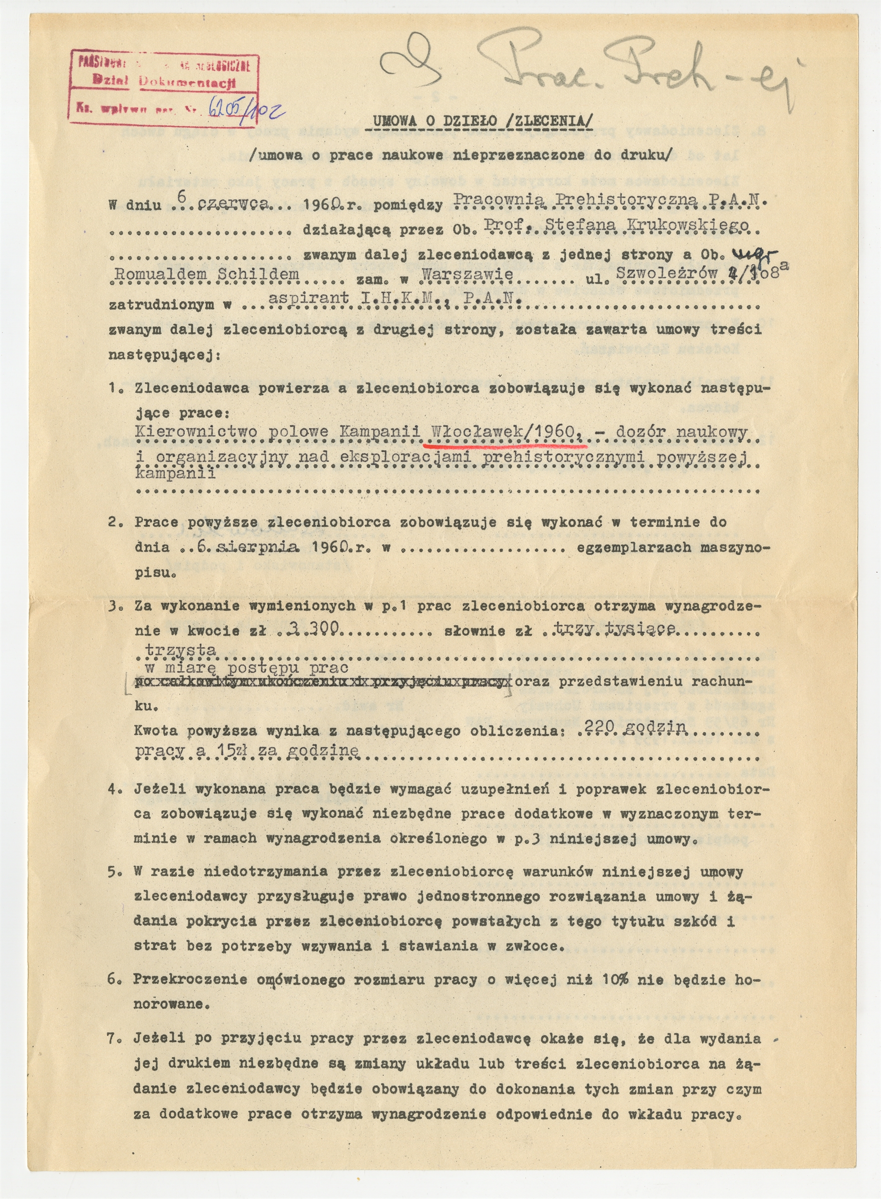 Wypełniony maszynopisem druk umowy o dzieło /zlecenie/ pomiędzy Pracownią Prehistoryczną P.A.N. a aspirantem I.H.K.M P.A.N. mgr Romualdem Schildem na wykonanie dozoru naukowego i organizacyjnego nad eksploracjami prehistorycznymi Kampanii Wocawek/1960 - strona 1: "W dniu" ... "do wkładu pracy" 6 czerwca 1960 (bez numeru strony)