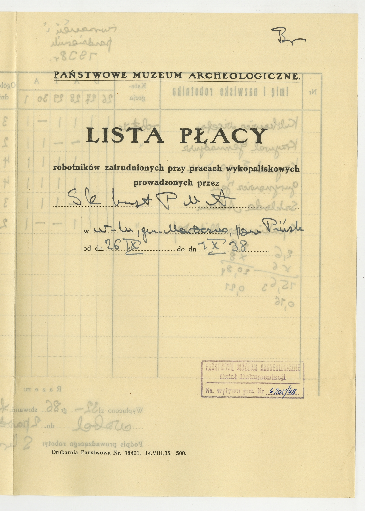Wypełniony rękopisem druk Państwowego Muzeum Archeologicznego zatytułowany "Lista Płacy" robotników zatrudnionych przy pracach wykopaliskowych prowadzonych przez S. K.[rukowskiego] w N-lu gm. Maraczno pow. Pińsk - strona 1: 26 IX - 1 X [19]38
