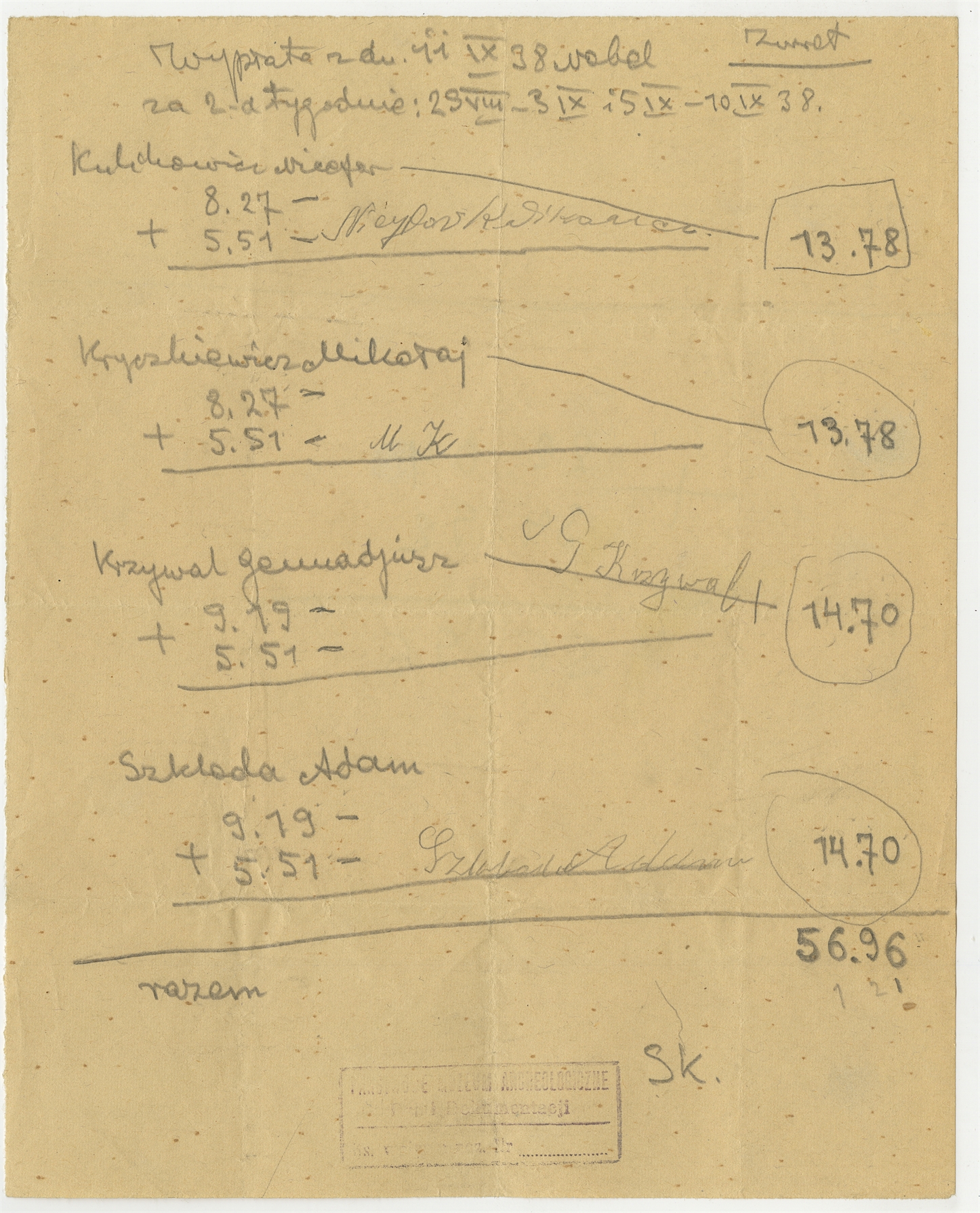 Wypełniony rękopisem druk Państwowego Muzeum Archeologicznego zatytułowany "Lista Płacy" robotników zatrudnionych przy pracach wykopaliskowych prowadzonych przez S. Krukowskiego w Noblu gm. Maraczno pow. Pińsk wraz z rękopisem notatek S. Krukowskiego dotyczącym podliczeń i rachunków - strona 3: zatytułowana "Wypłata z dn. 11 IX 38 (Nobel) za 2-a tygodnie: 29 VIII - 3 IX i 5 IX - 10 IX [19]38" (bez numeru strony)