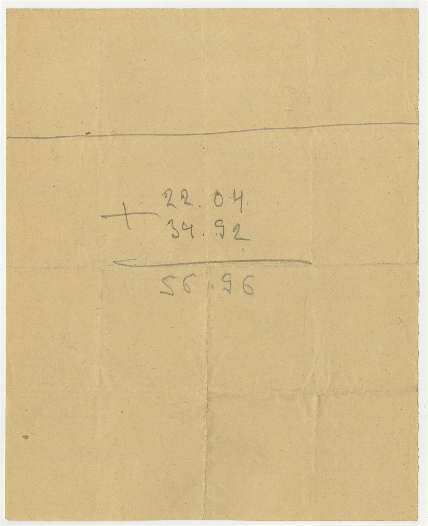 Wypełniony rękopisem druk Państwowego Muzeum Archeologicznego zatytułowany "Lista Płacy" robotników zatrudnionych przy pracach wykopaliskowych prowadzonych przez S. Krukowskiego w Noblu gm. Maraczno pow. Pińsk wraz z rękopisem notatek S. Krukowskiego dotyczącym podliczeń i rachunków - strona 4: zawiera słupek rachunkowy na sumę 56.96 (bez numeru strony)