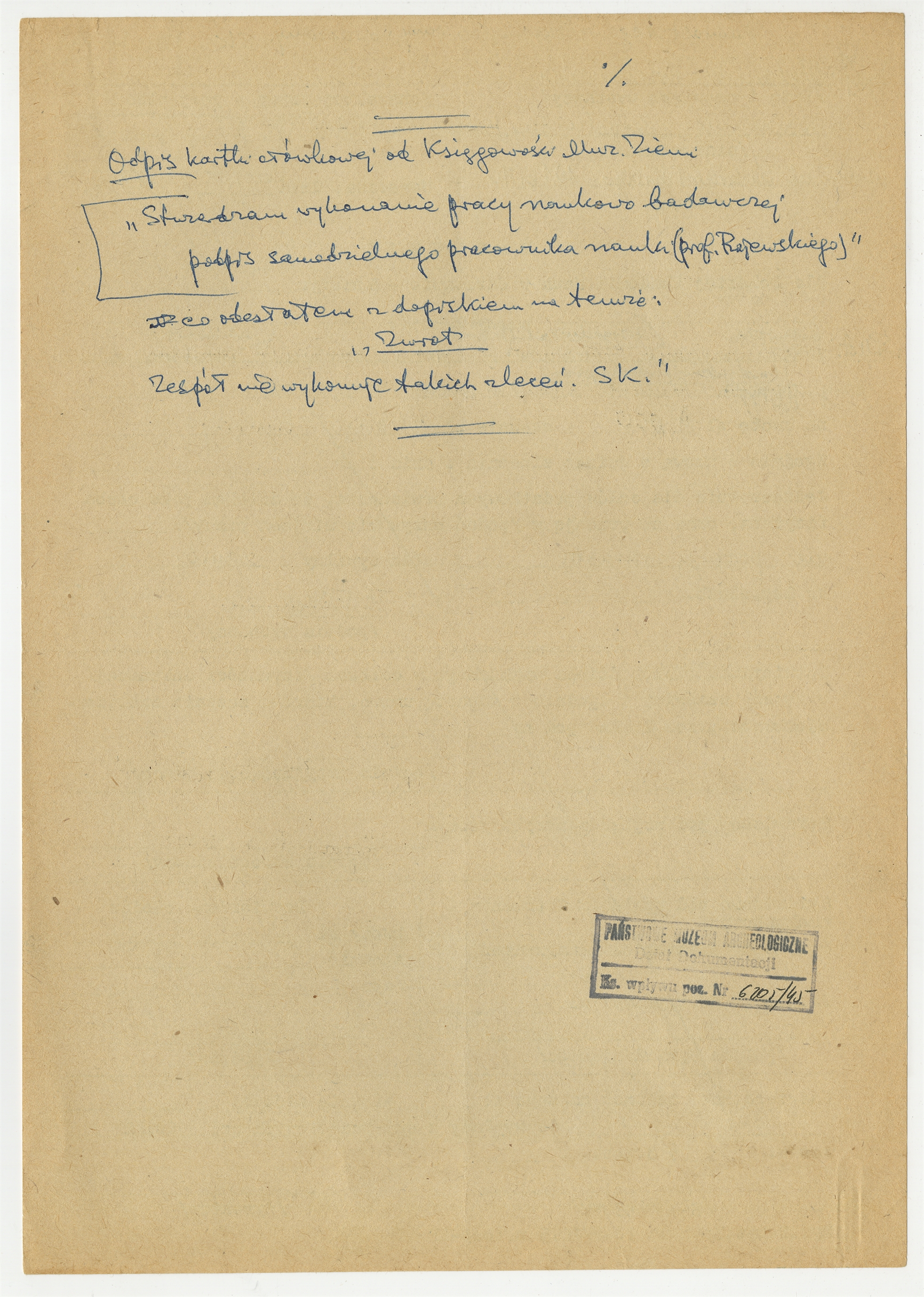 Wypełniony rękopisem druk rachunku dla Polskiej Akademii Nauk w Warszawie za badawcze opracowanie materiałów oraz zagadnień prehistorycznych wystawiony na nazwisko Stefana W. Krukowskiego - strona 1: tylna - zawiera rękopis notatki S. Krukowskiego zatytułowany "Odpis kartki ołówkowej od Księgowości Muz. Ziemi" (bez numeru strony)