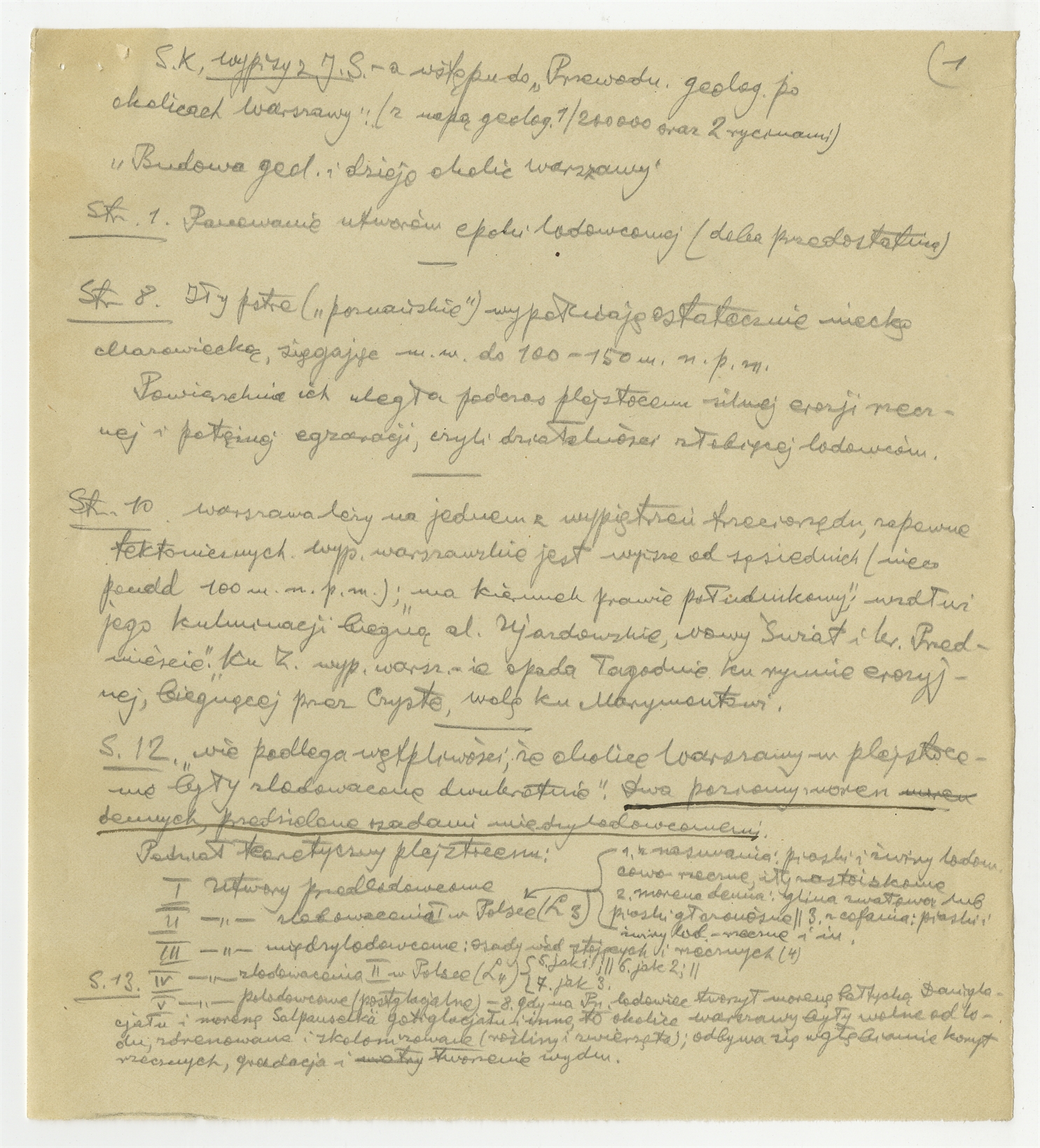 Wypisy i notatki S. Krukowskiego z publikacji - J. Samsonowicz "Przewodnik geologiczny po okolicach Warszawy" - strona 1: zatytuowana "S.K wypisy z J.S.-a wstępu do "Przewod. Geolog. Po okolicach Warszawy: (z mapą geolog. 1/200 000 oraz 2 rycinami" - "Budowa geologiczna i dzieje okolic Warszawy" - strona 1: dotyczy stron str.1 str.8 str.10 str.12 S.13 (autorska strona 1)
