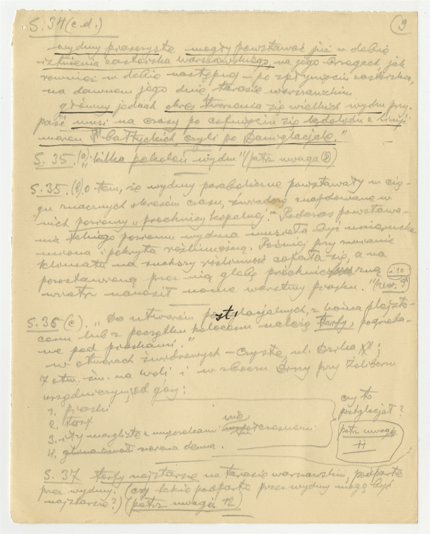 Wypisy i notatki S. Krukowskiego z publikacji - J. Samsonowicz "Przewodnik geologiczny po okolicach Warszawy" - strona 11: dotyczy stron S.34 (c.d.) S.35 S.36 S.37 (autorska strona 9)