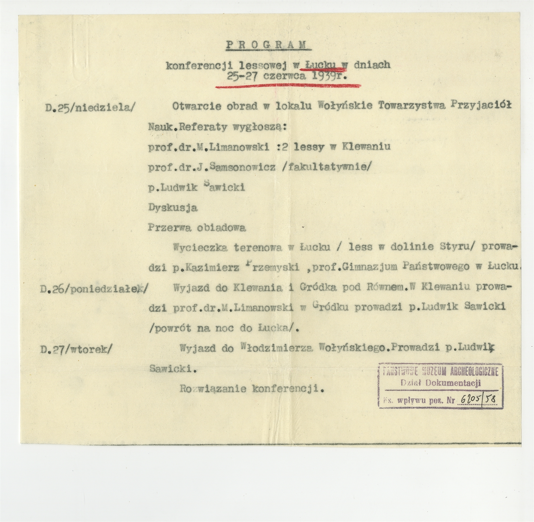 Załącznik do listu Wołyńskiego Towarzystwa Przyjaciół Nauk do prof. Stefana Krukowskiego z programem konferencji lessowej w Łucku w dniach 25-27 VI 1939 r. program skrócony ostatnie słowa "Rozwiązanie konferencji"