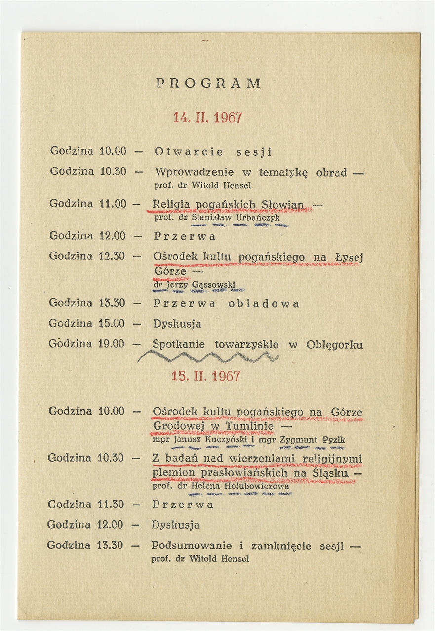 Zaproszenie do wzięcia udziału w sesji naukowej poświęconej problematyce Religii Pogańskich Słowian 14 - 15 II 1976 Kielce z notatkami i podkreśleniami odręcznymi - program