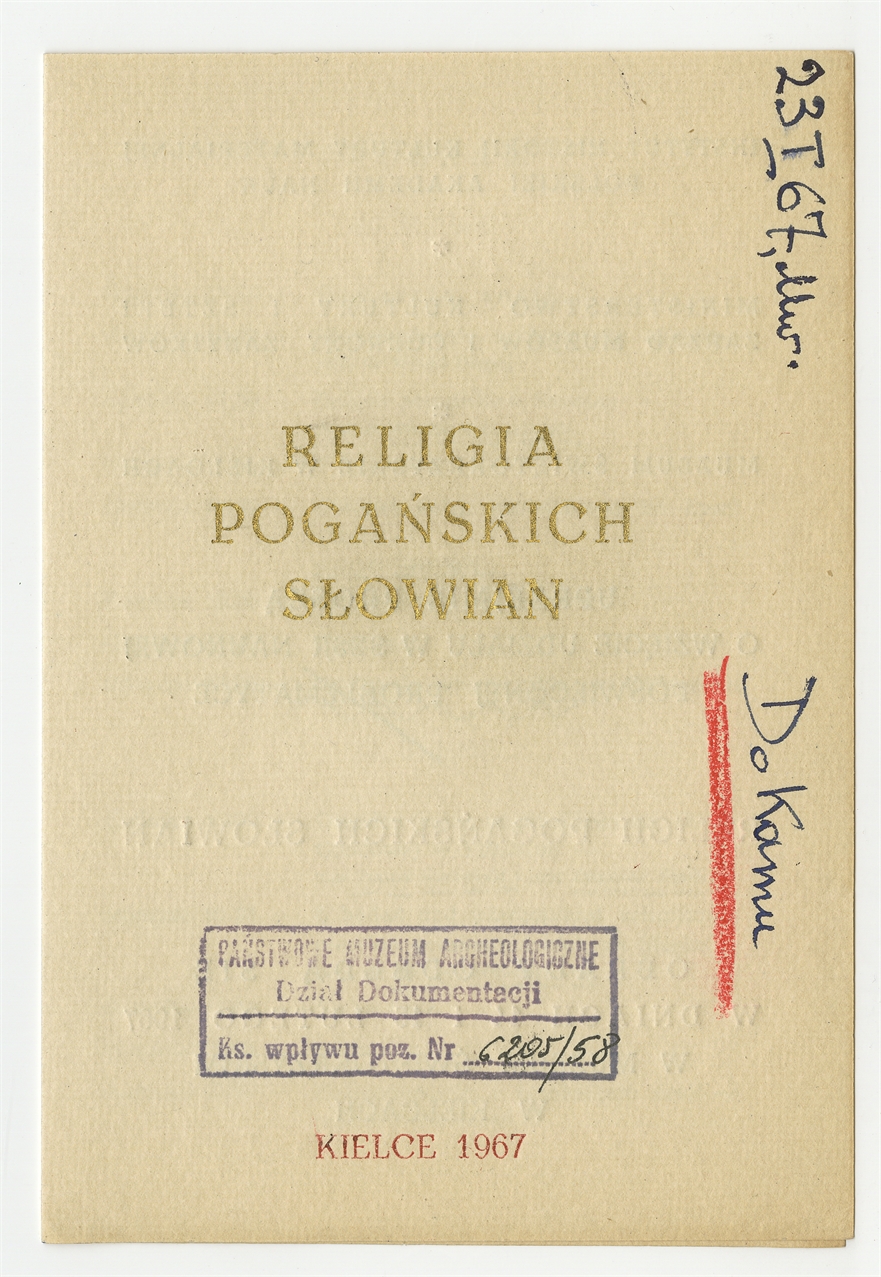 Zaproszenie do wzięcia udziału w sesji naukowej poświęconej problematyce Religii Pogańskich Słowian 14 - 15 II 1976 Kielce z notatkami i podkreśleniami odręcznymi - strona tytułowa