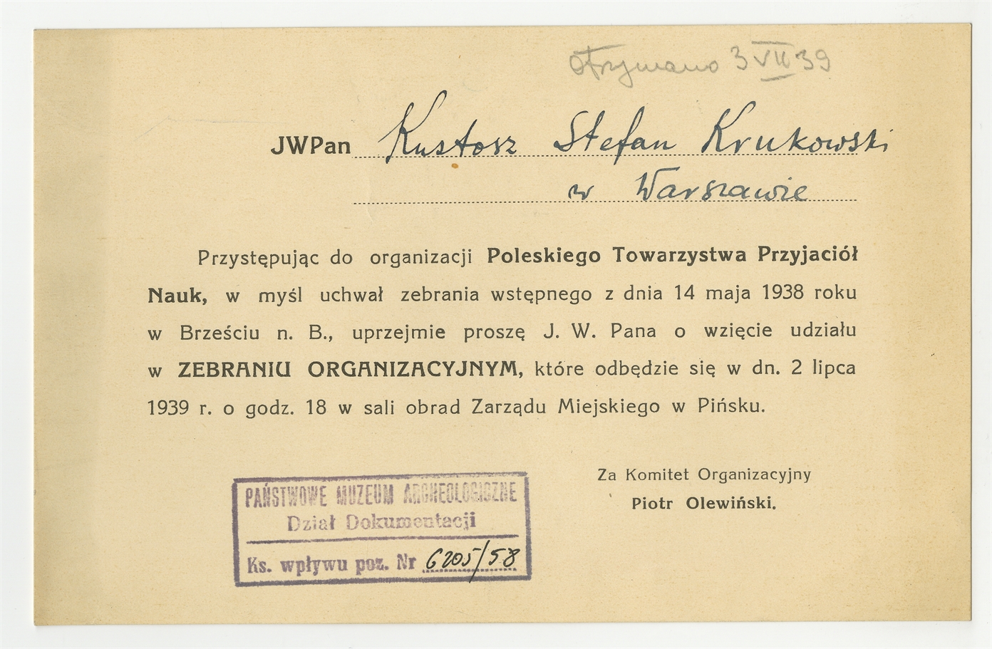 Zaproszenie do wzięcia udziału w Zebraniu Organizacyjnym Polskiego Towarzystwa Przyjaciół Nauk skierowane do "JW Pan Kustosz Stefan Krukowski w Warszawie" z notatką ręczną "otrzymano 3 VII 39"