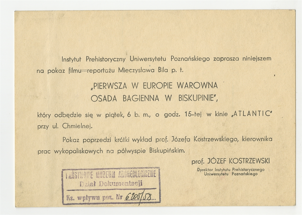 Zaproszenie na pokaz filmu "Pierwsza w Europie Warowna Osada Bagienna w Biskupinie" w Warszawie