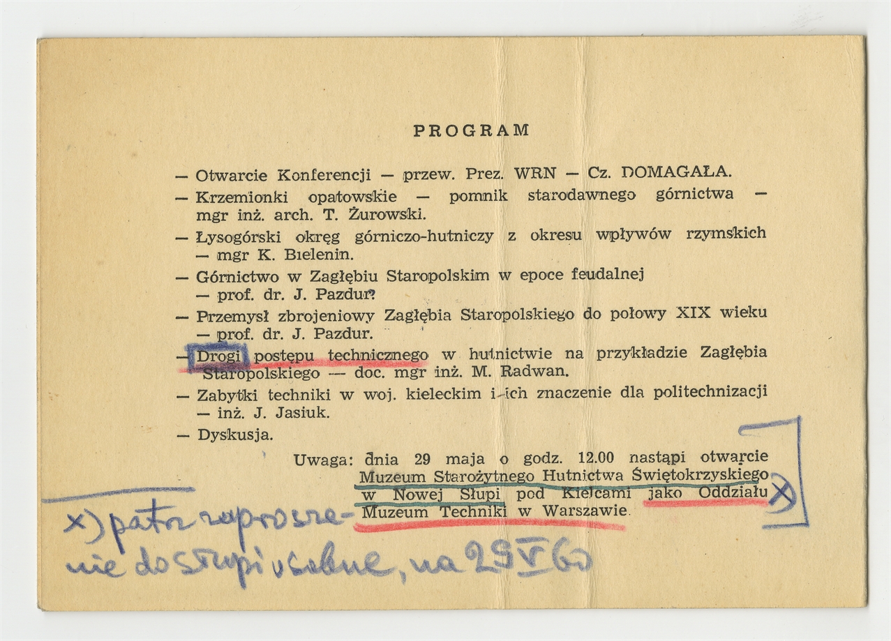 Zaproszenie Wojewódzkiej Komisji Obchodu Tysiąclecia Państwa Polskiego skierowane do prof. Stefana Krukowskiego na Konferencję Naukową poświęconą problematyce Zagłębia Staropolskiego z ręcznymi notatkami prof. Krukowskiego "otrz. 20 V 1960" - program z odręcznymi notatkami