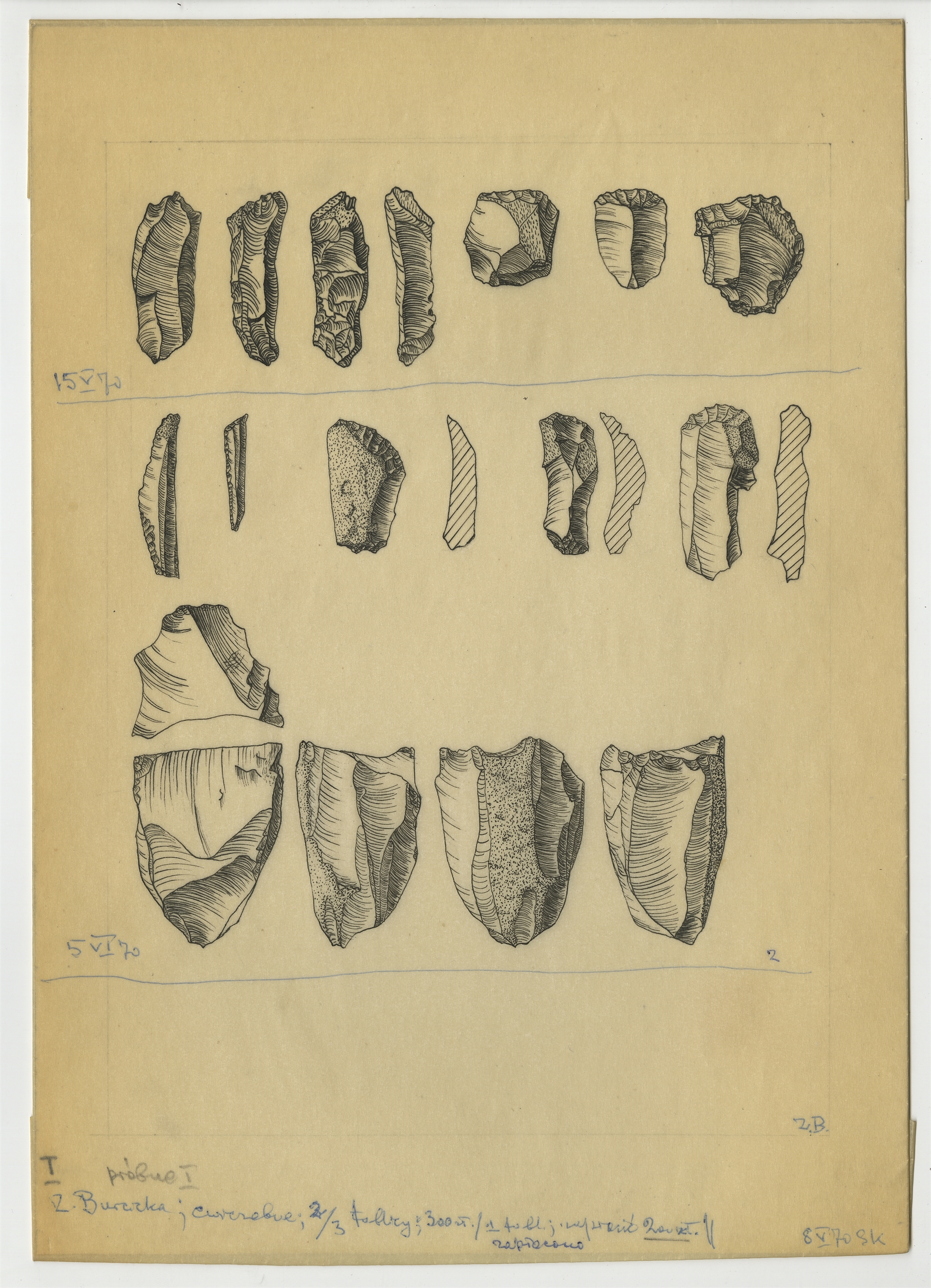 Zbiór 11 tablic próbnych zawierających rysunki zabytków krzemiennych o nieznanej proweniencji wykonane na kalce przez Z. Burcicką oraz Marka Młynarskiego w latach 1969-1970 - strona 1: tablica I sporządzona w okresie 5-15 VI [19]70 r. przez Z. Burcicką