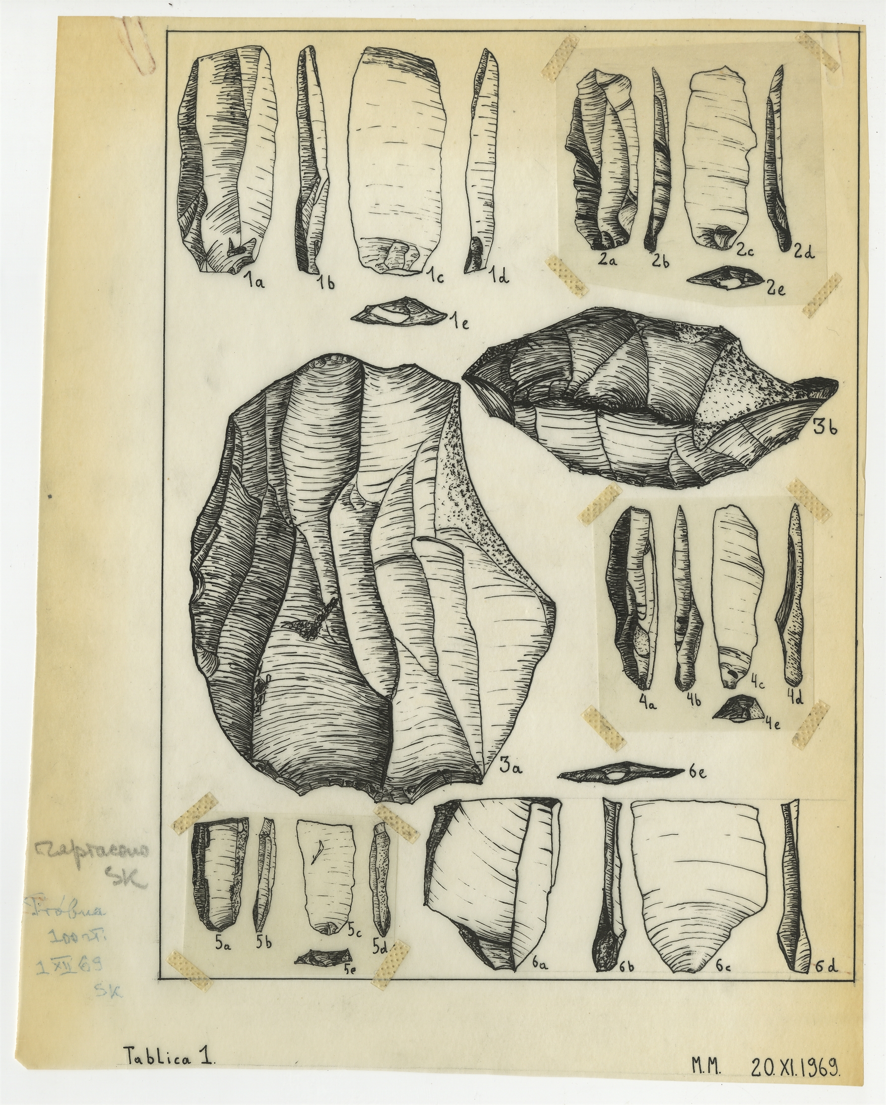 Zbiór 11 tablic próbnych zawierających rysunki zabytków krzemiennych o nieznanej proweniencji wykonane na kalce przez Z. Burcicką oraz Marka Młynarskiego w latach 1969-1970 - strona 2: "Tablica 1" sporządzona przez Marka Młynarskiego 20 XI 1969 r.