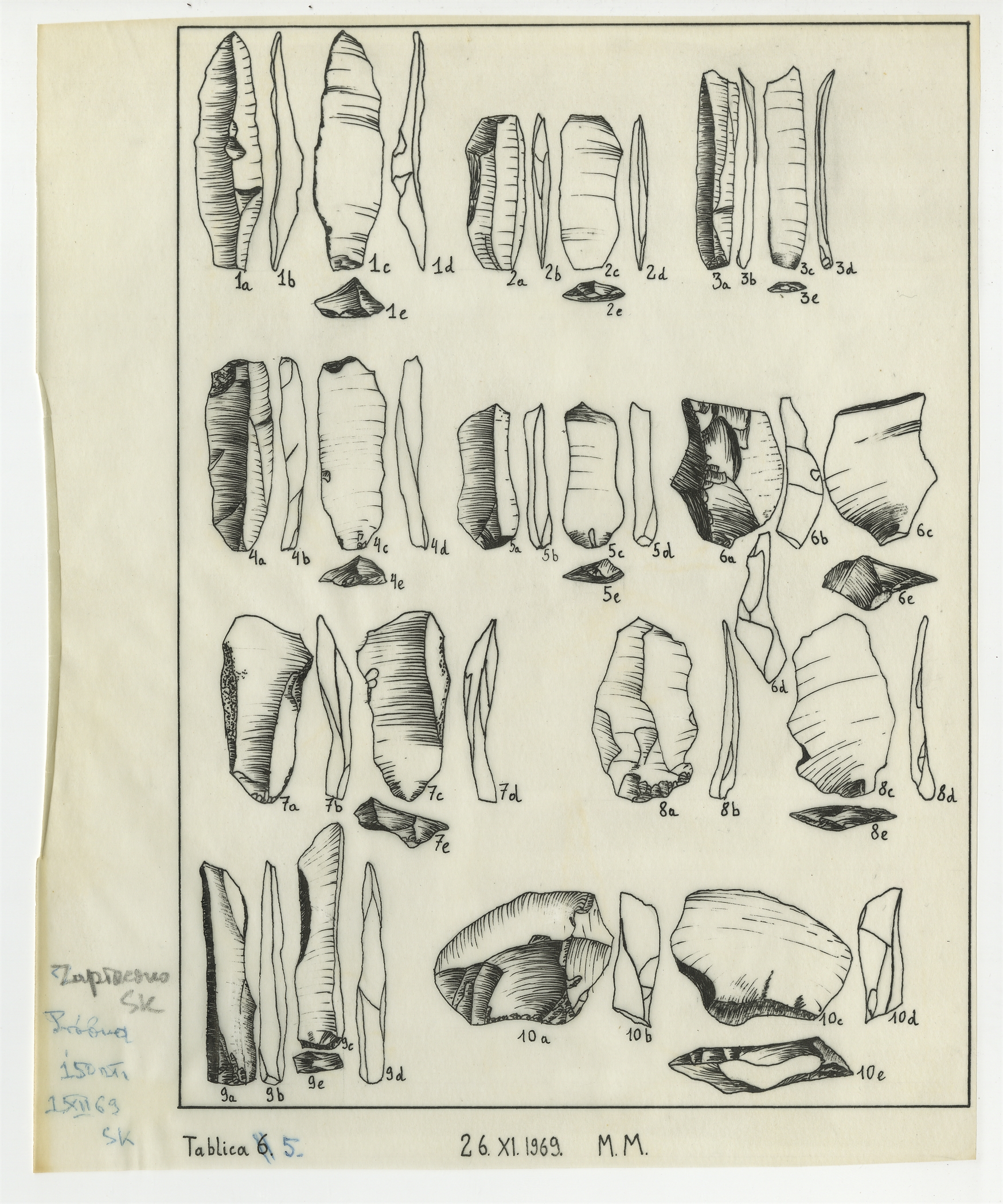 Zbiór 11 tablic próbnych zawierających rysunki zabytków krzemiennych o nieznanej proweniencji wykonane na kalce przez Z. Burcicką oraz Marka Młynarskiego w latach 1969-1970 - strona 6: "Tablica 5" sporządzona przez Marka Młynarskiego 26 XI 1969 r.