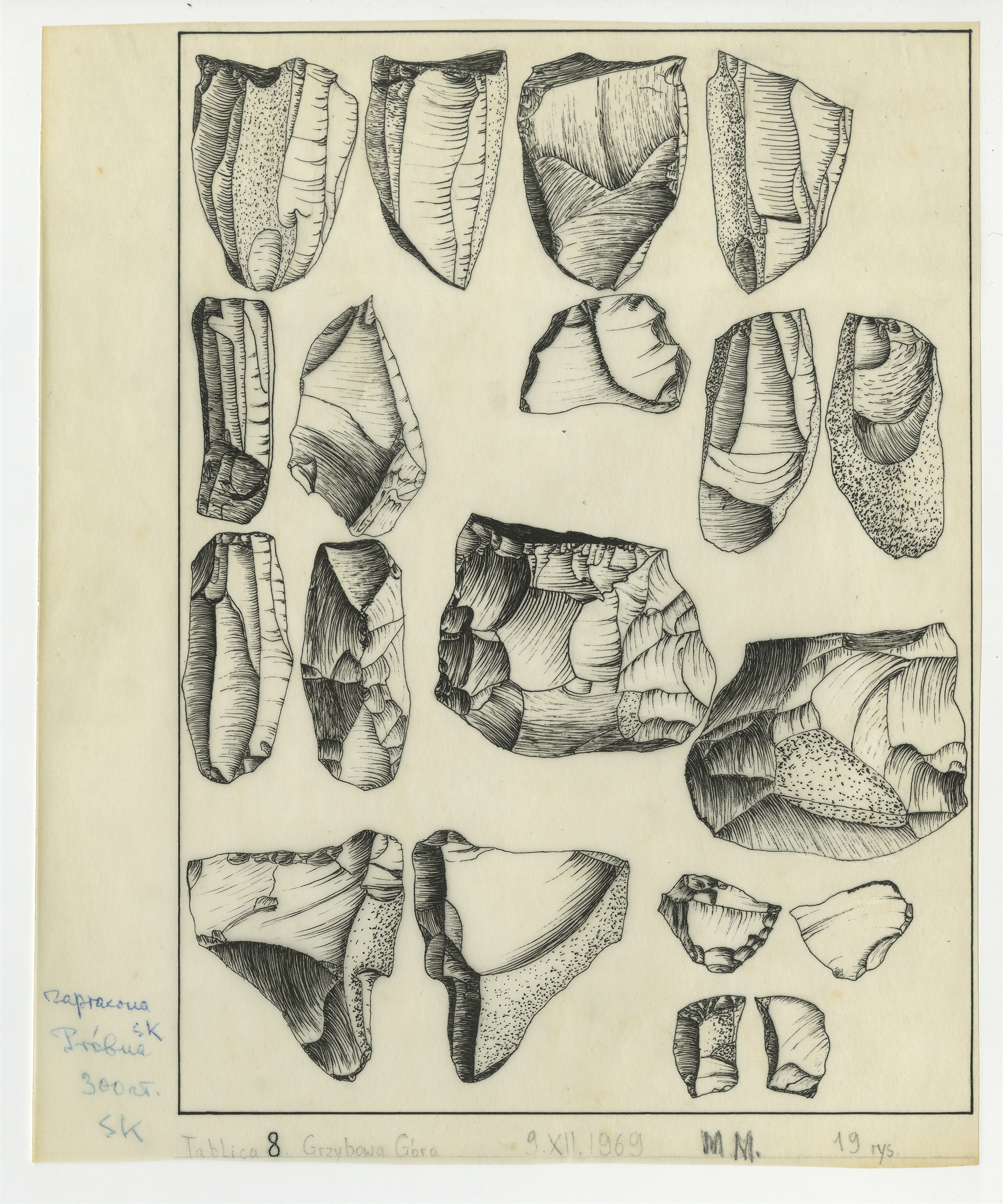 Zbiór 11 tablic próbnych zawierających rysunki zabytków krzemiennych o nieznanej proweniencji wykonane na kalce przez Z. Burcicką oraz Marka Młynarskiego w latach 1969-1970 - strona 9: "Tablica 8" sporządzona przez Marka Młynarskiego 9 XII 1969 r. (zabytki z Góry Grzybowej?)