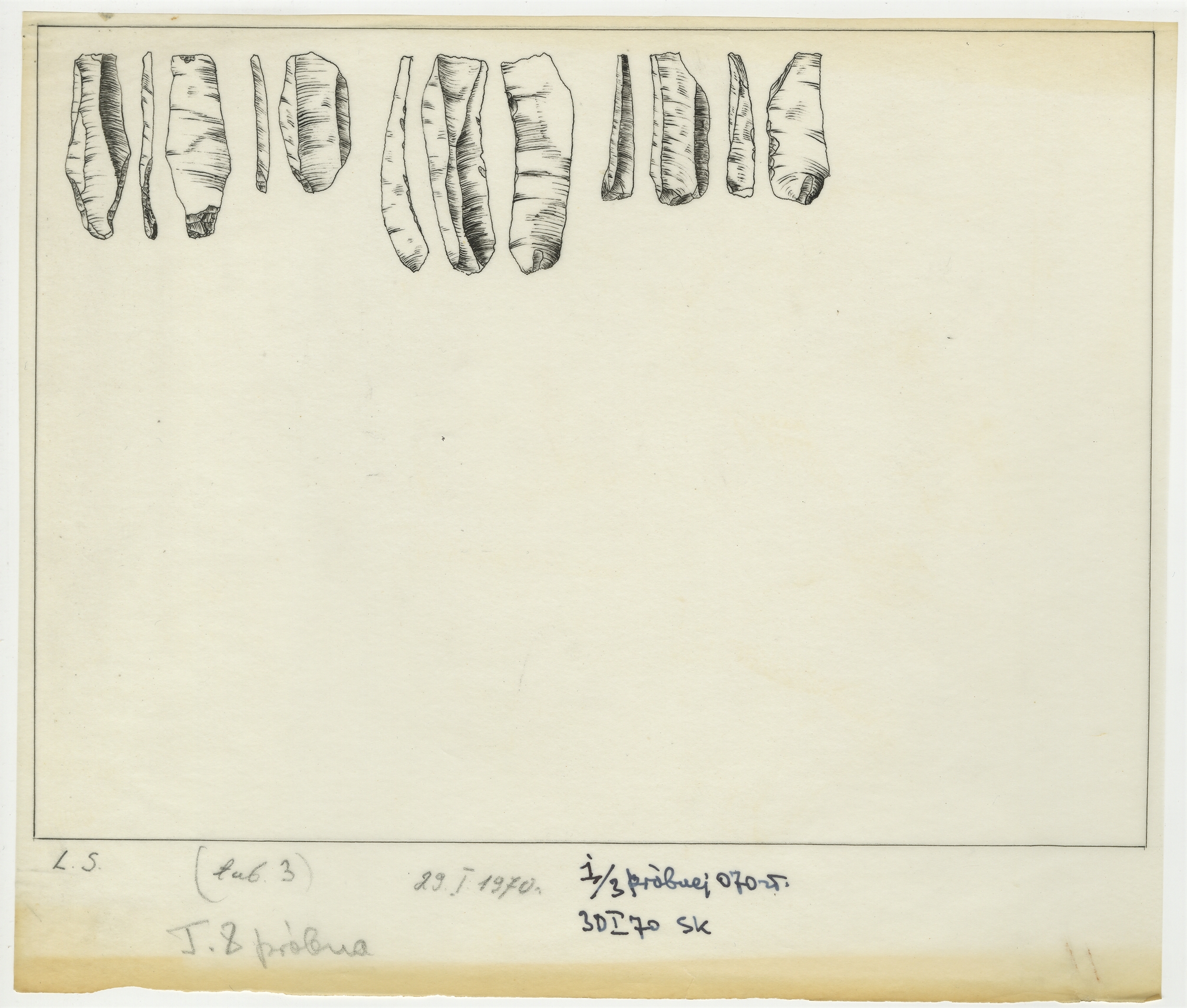 Zbiór 25 tablic próbnych zawierających rysunki zabytków krzemiennych o nieznanej proweniencji wykonanych na kalkach w latach 1969-1975 - tablica 10: "T. 8 próbna" L.S. 29 I 1970 r.