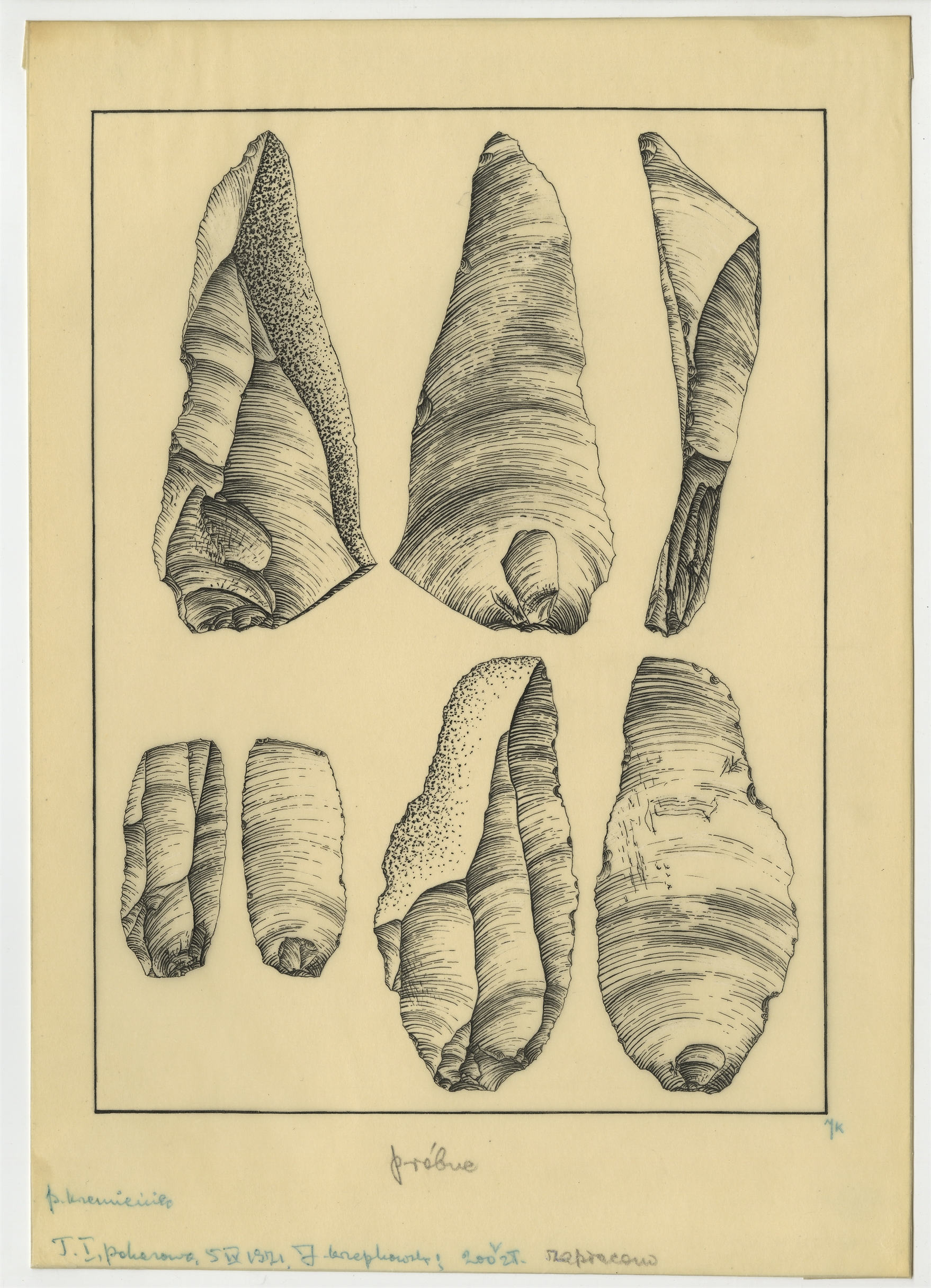 Zbiór 25 tablic próbnych zawierających rysunki zabytków krzemiennych o nieznanej proweniencji wykonanych na kalkach w latach 1969-1975 - tablica 14: "T. I pokazowa" autorstwa J. Krzepkowskiej 5 IV 1971 r.