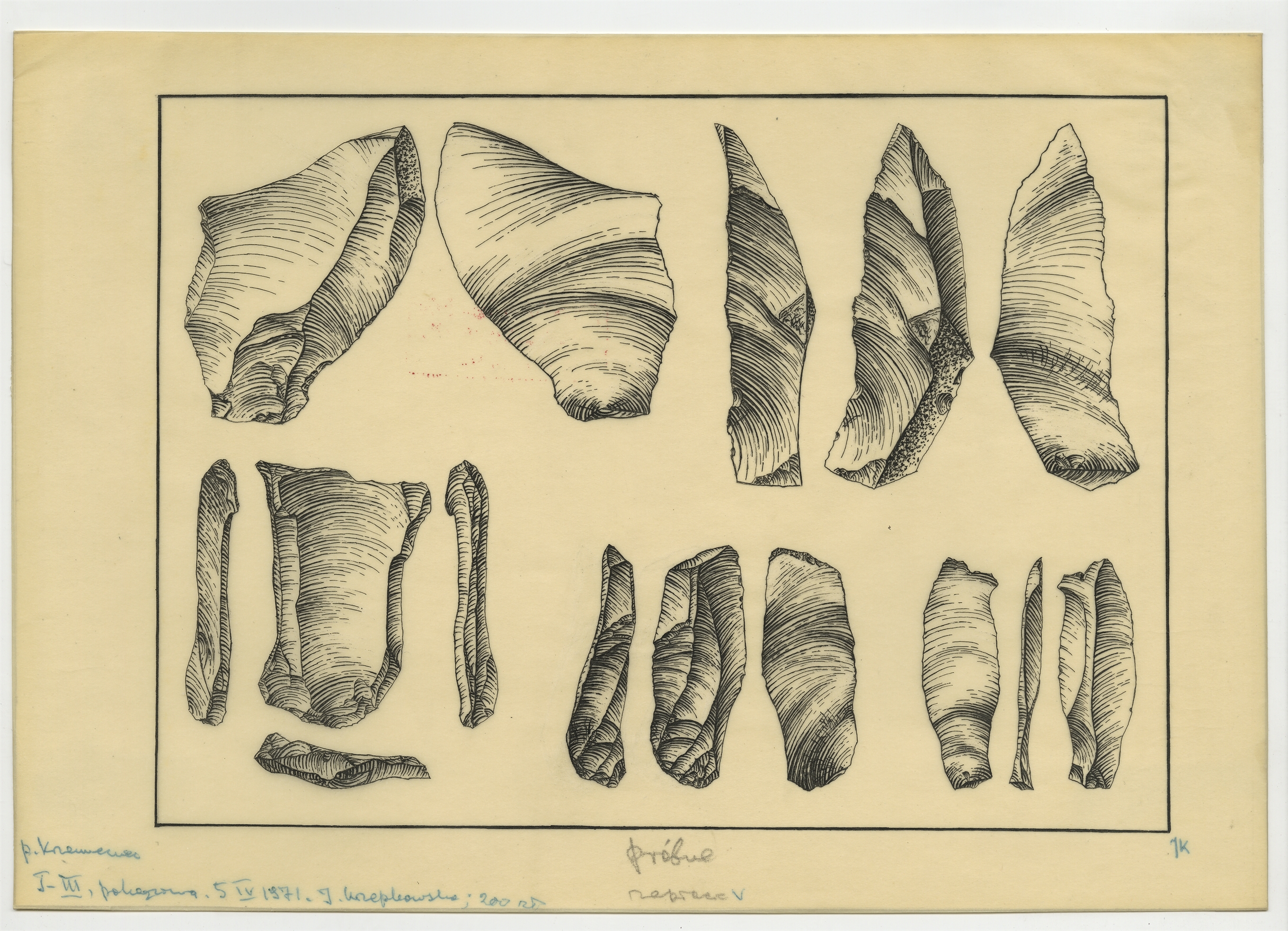 Zbiór 25 tablic próbnych zawierających rysunki zabytków krzemiennych o nieznanej proweniencji wykonanych na kalkach w latach 1969-1975 - tablica 16: "T. III pokazowa" autorstwa J. Krzepkowskiej 5 IV 1971 r.
