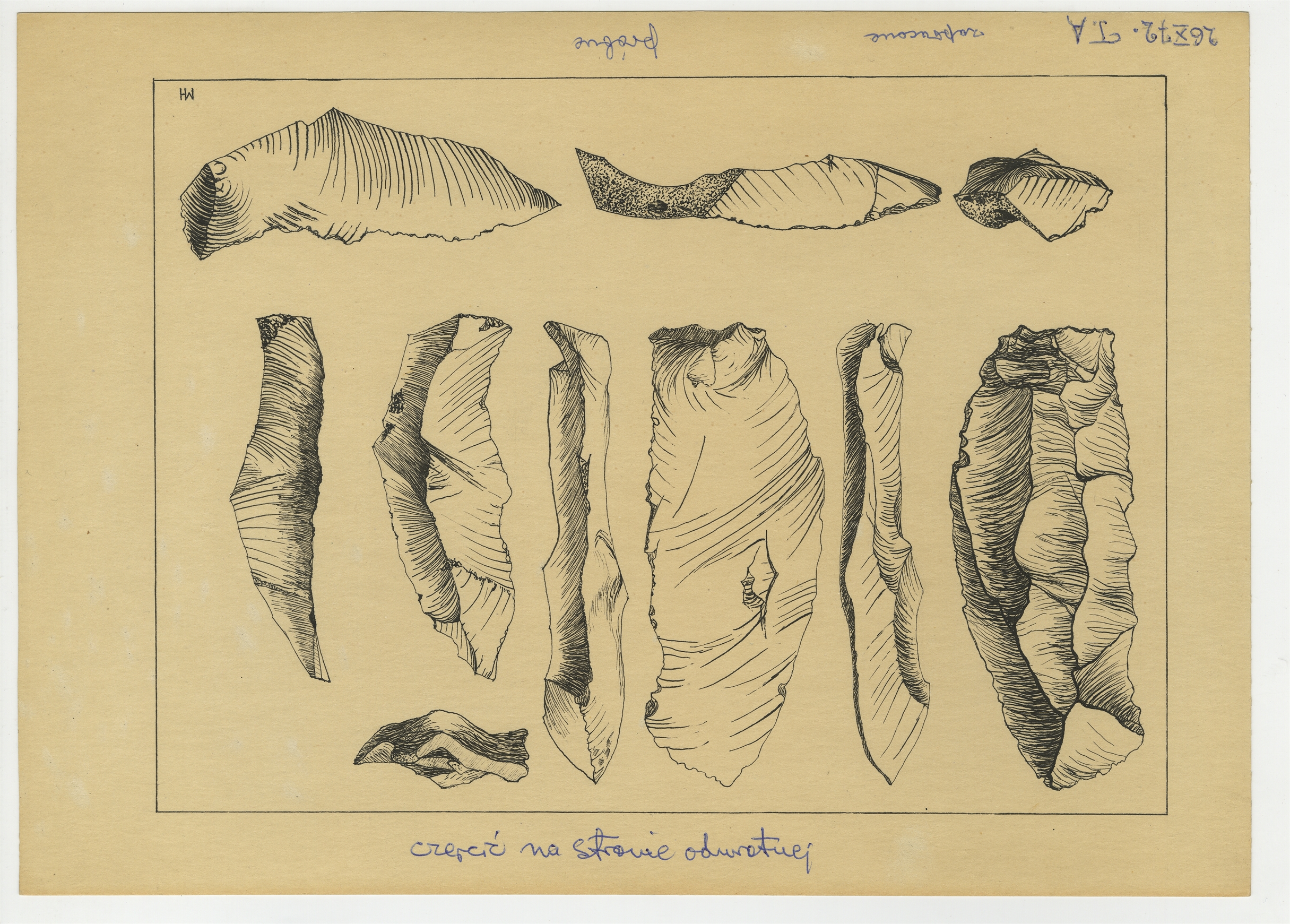 Zbiór 25 tablic próbnych zawierających rysunki zabytków krzemiennych o nieznanej proweniencji wykonanych na kalkach w latach 1969-1975 - tablica 17: "T. A." autorstwa M. Heintze (sygnatura MH) 26 X [19]72 r.