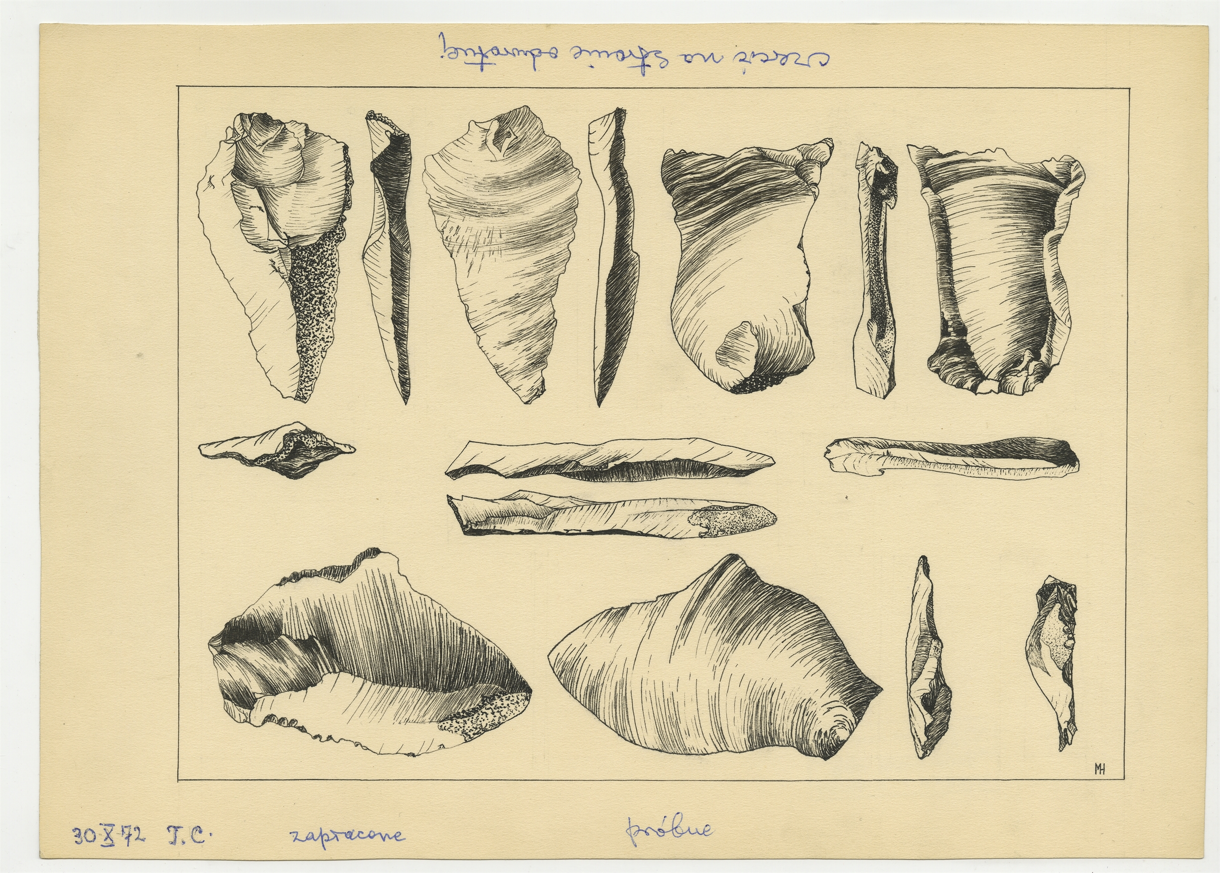 Zbiór 25 tablic próbnych zawierających rysunki zabytków krzemiennych o nieznanej proweniencji wykonanych na kalkach w latach 1969-1975 - tablica 19: "T. C." autorstwa M. Heintze (sygnatura MH) 30 X [19]72 r.
