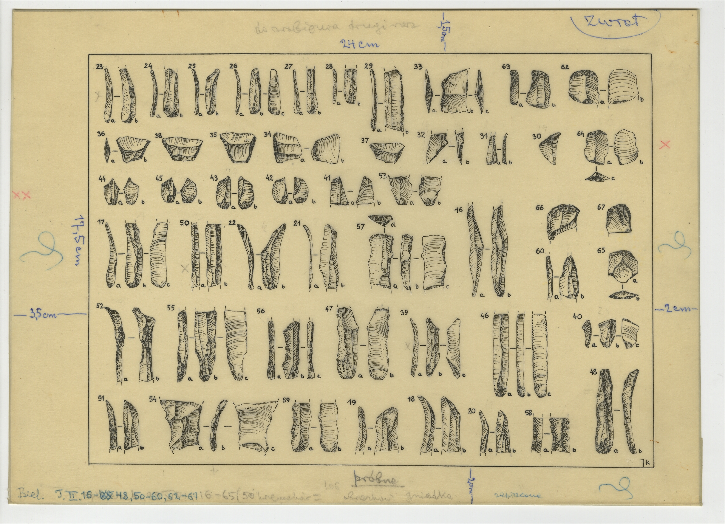 Zbiór 25 tablic próbnych zawierających rysunki zabytków krzemiennych o nieznanej proweniencji wykonanych na kalkach w latach 1969-1975 - tablica 25: "Biel. T.II.16-48 50-60 62-67"