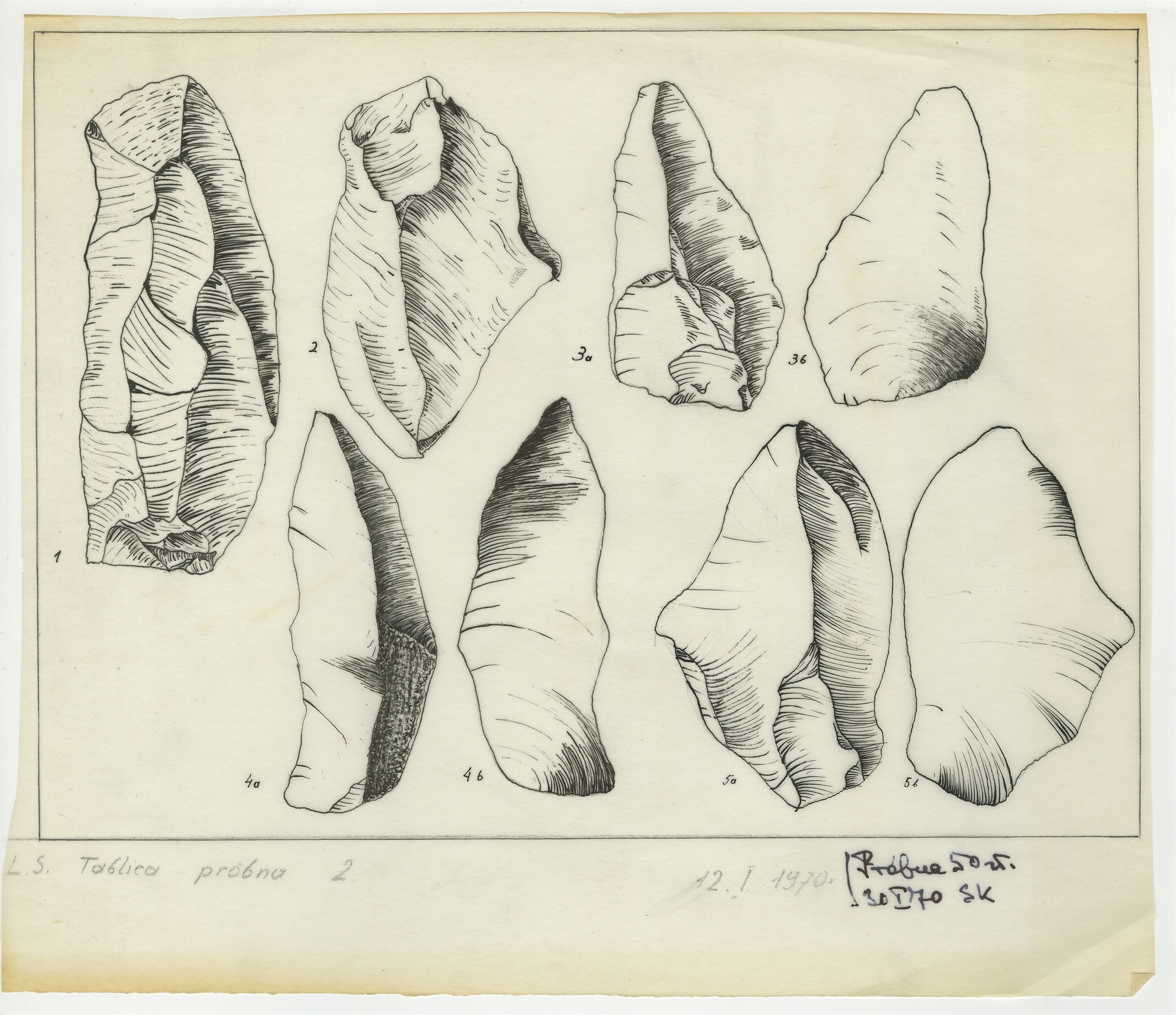 Zbiór 25 tablic próbnych zawierających rysunki zabytków krzemiennych o nieznanej proweniencji wykonanych na kalkach w latach 1969-1975 - tablica 4: "Tablica próbna 2" L.S. 12 I 1970 r.